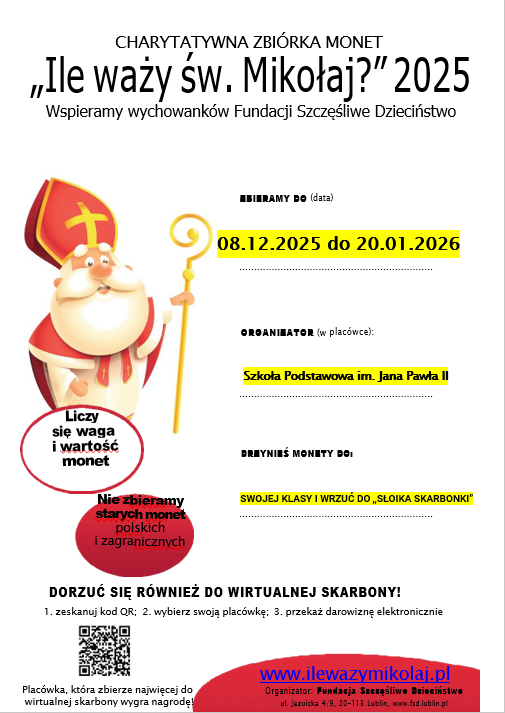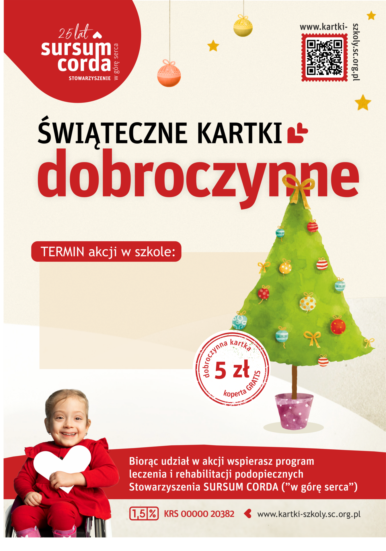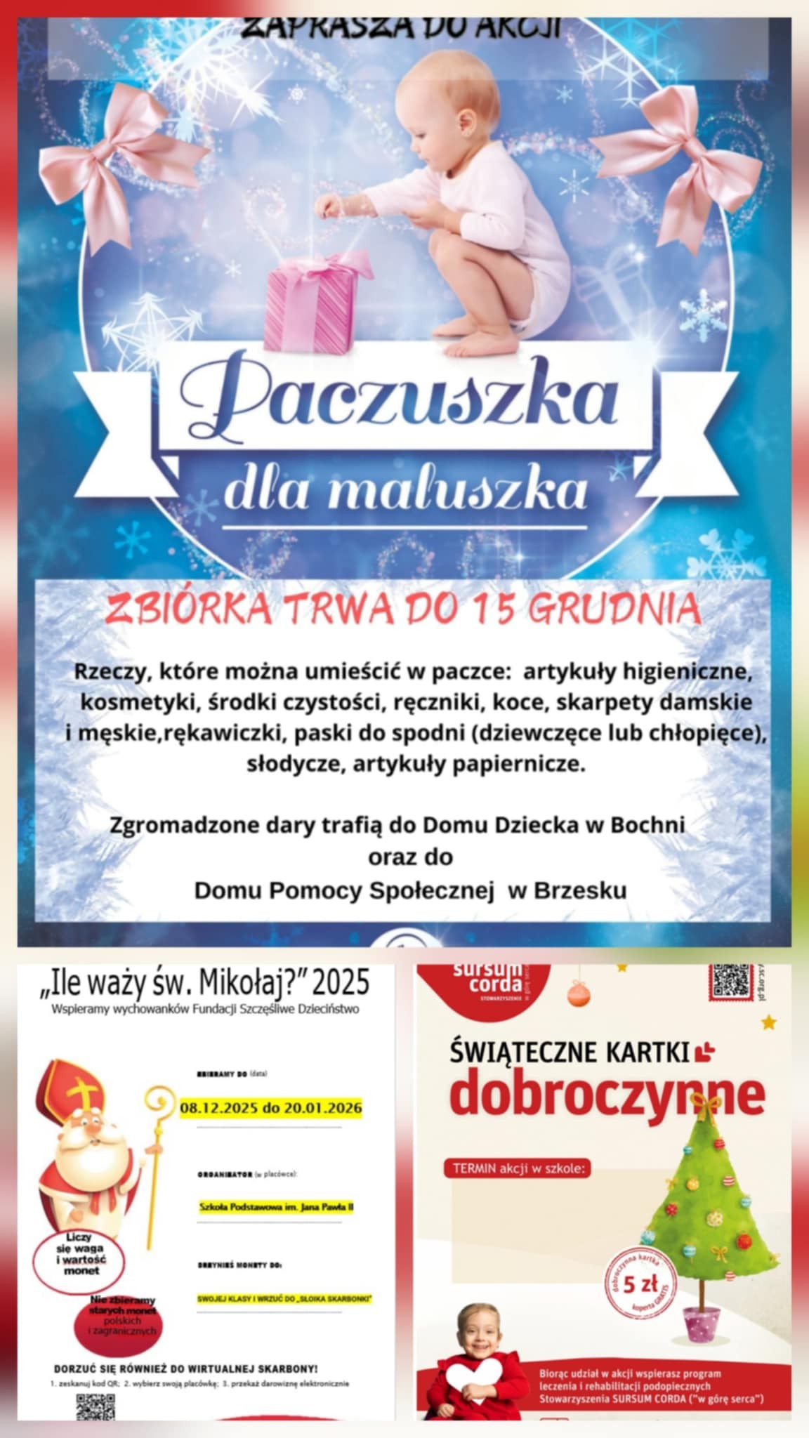 Paczuszka dla Maluszka- pomóżmy najmłodszym! Każdy z Was może przynieść drobny upominek – kosmetyki, artykuły higieniczne, środki czystości czy też słodycze. Razem stworzymy piękne paczki dla dzieci, które potrzebują wsparcia i ciepła. Ile waży Święty Mikołaj? -wrzucając symboliczny grosik, pomagacie chorym i potrzebującym. Im więcej dobra uzbieramy, tym „cięższy” stanie się Mikołaj – a jego wielkie, czerwone serce będzie biło jeszcze mocniej! Świąteczne Kartki Dobroczynne- możecie kupić przepiękne kartki świąteczne, a cały dochód wesprze dzieci potrzebujące rehabilitacji i leczenia. Jedna kartka potrafi przynieść tyle radości!