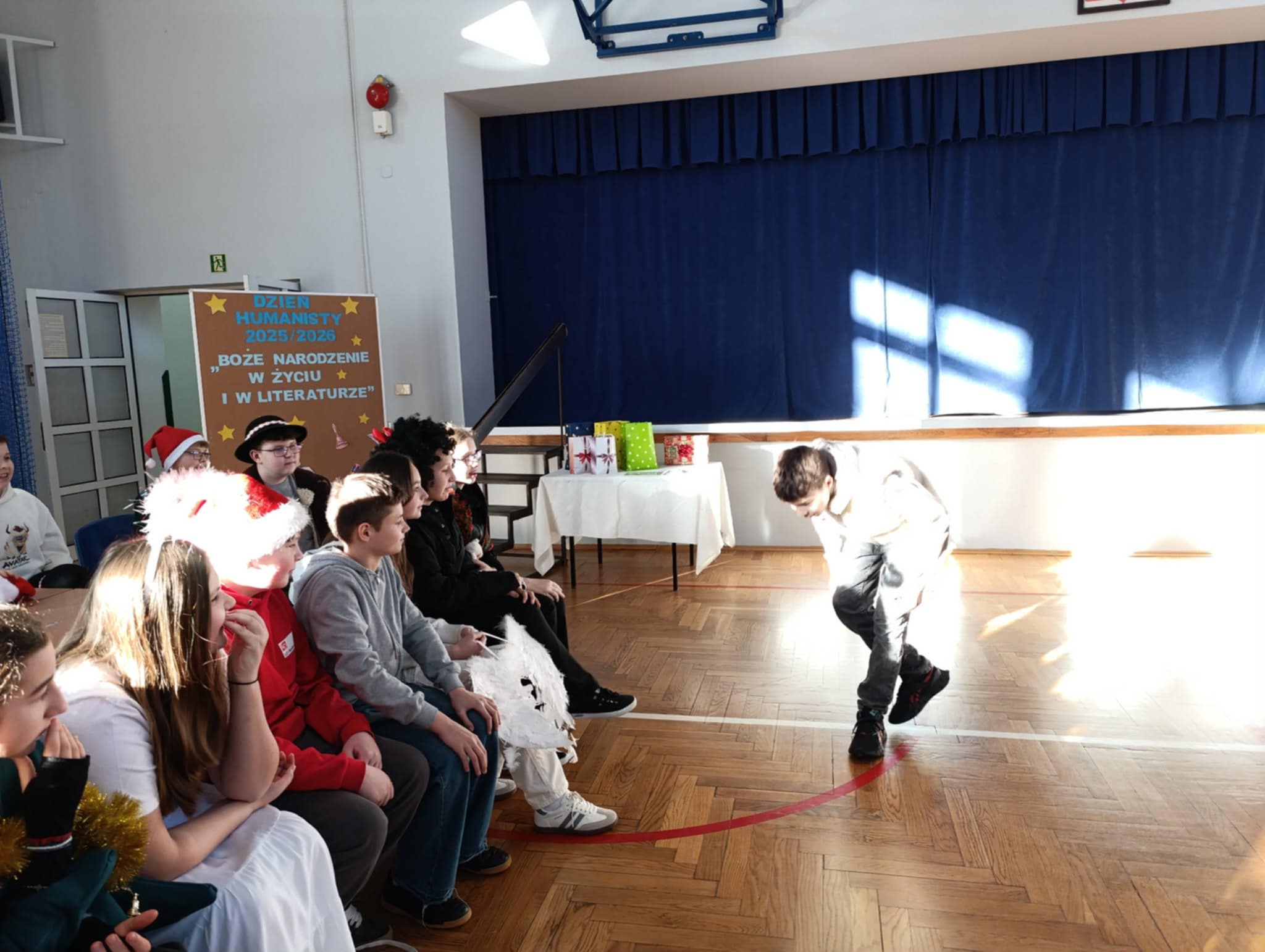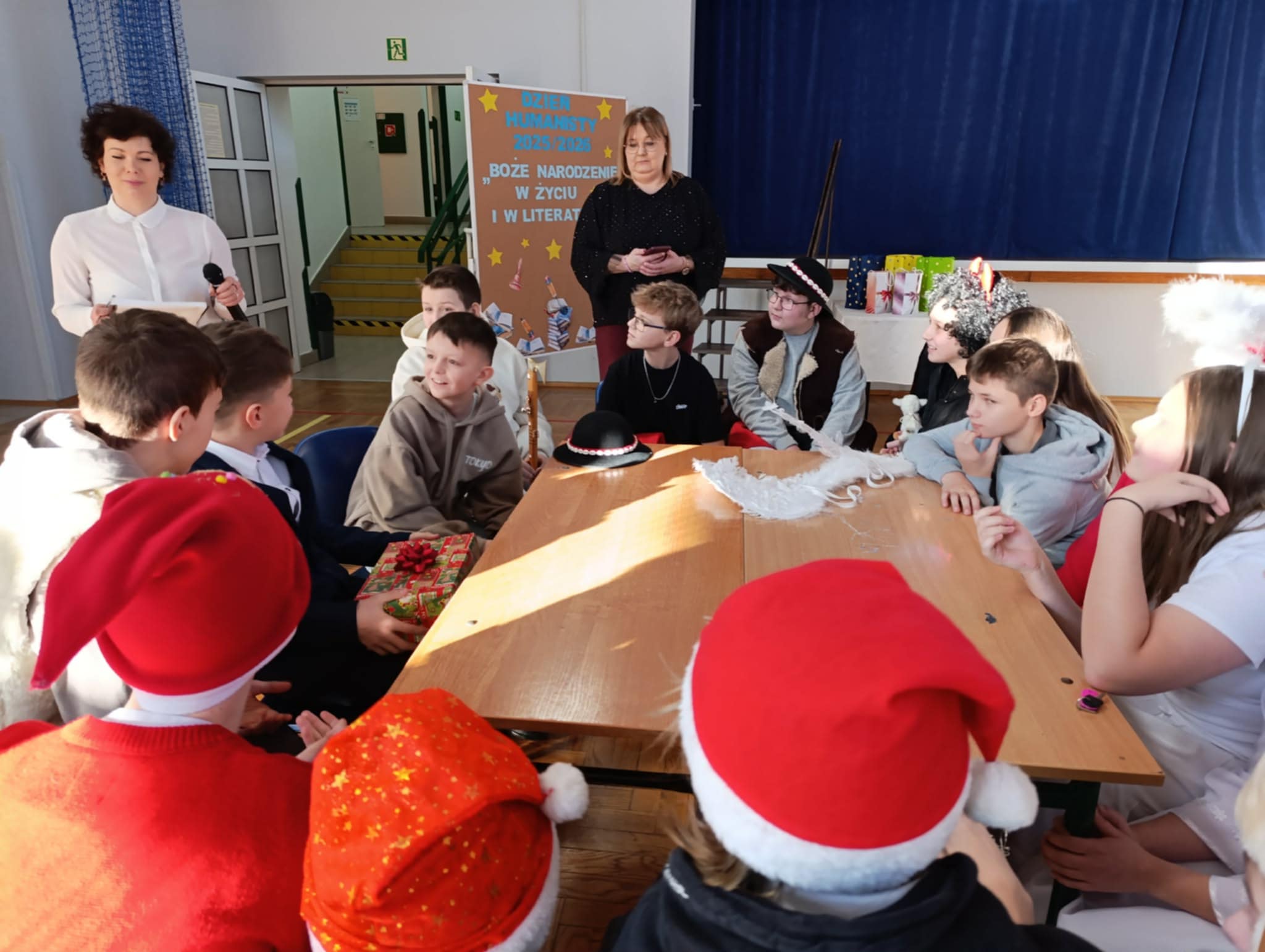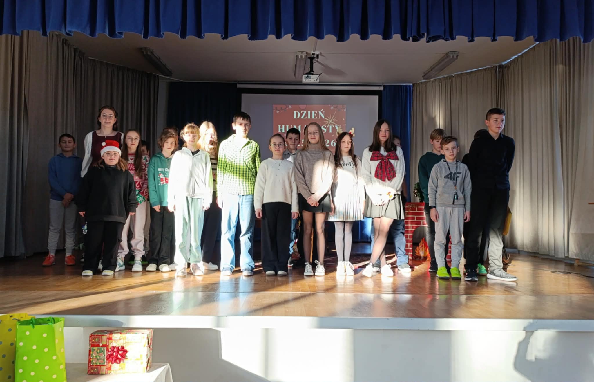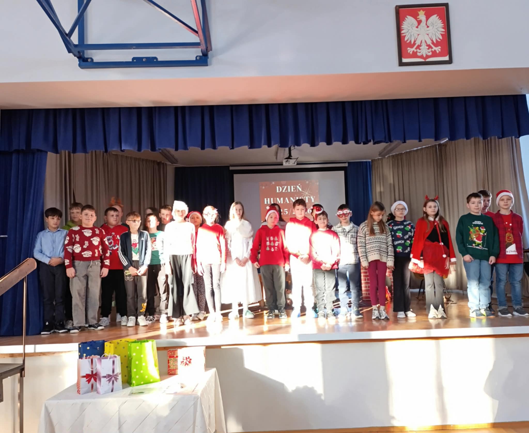 Ideą Dnia Humanisty jest przede wszystkim kształtowanie wrażliwości humanistycznej, budowanie przywiązania do literatury i sztuki, a także rozwijanie zainteresowania książkami i lekturami szkolnymi. To czas, w którym uczniowie mogą inspirować się bohaterami literackimi, poszukiwać kreatywnych rozwiązań, pobudzać wyobraźnię oraz odkrywać różnorodne formy artystycznego wyrazu. Ważnym elementem tego dnia jest również kultywowanie chrześcijańskich tradycji bożonarodzeniowych, które sprzyjają refleksji, wspólnemu przeżywaniu wartości oraz budowaniu wspólnoty szkolnej. Podczas tegorocznego Dnia Humanisty uczniowie klas 6, 7 i 8 zmierzyli się z różnorodnymi konkurencjami inspirowanymi znanymi i cenionymi lekturami: „Dziewczyną z zapałkami” H. Ch. Andersena, „Opowieściami z Narnii” C. S. Lewisa oraz „Opowieścią wigilijną” Ch. Dickensa. Każda z klas musiała wykazać się nie tylko znajomością treści utworów, ale również kreatywnością, pomysłowością i umiejętnością pracy zespołowej. W ramach przygotowań uczniowie zadbali o świąteczne przebrania, wykonali plakaty nawiązujące do wybranych lektur, a także przygotowali występy teatralne, w których w ciekawy sposób uwspółcześnili przesłanie literackich dzieł, pokazując, że poruszane w nich wartości są nadal aktualne. Nie zabrakło również elementu rywalizacji – klasy brały udział w quizie wiedzy z lektur, świątecznym dyktandzie, bożonarodzeniowych kalamburach, a także zaprezentowały wywiady dotyczące tradycji bożonarodzeniowych – z przedstawicielami starszego pokolenia – babciami i dziadkami, wytypowanymi przez poszczególne klasy. Goście w nagraniach z wielkim zaangażowaniem dzielili się swoimi wspomnieniami i doświadczeniami związanymi z obchodami Świąt Bożego Narodzenia, przybliżając uczniom dawne zwyczaje, rodzinne tradycje oraz atmosferę świąt sprzed lat. Wszyscy uczestnicy Dnia Humanisty zasługują na ogromne uznanie i gratulacje. Każda z klas zaprezentowała się w sposób imponujący, wykazując się dużą wiedzą na temat omawianych lektur, kreatywnością oraz zaangażowaniem. Uczniowie przygotowali wspaniałe występy teatralne, a podczas quizu wiedzy z lektur z ogromną determinacją i zapałem walczyli o kolejne punkty.