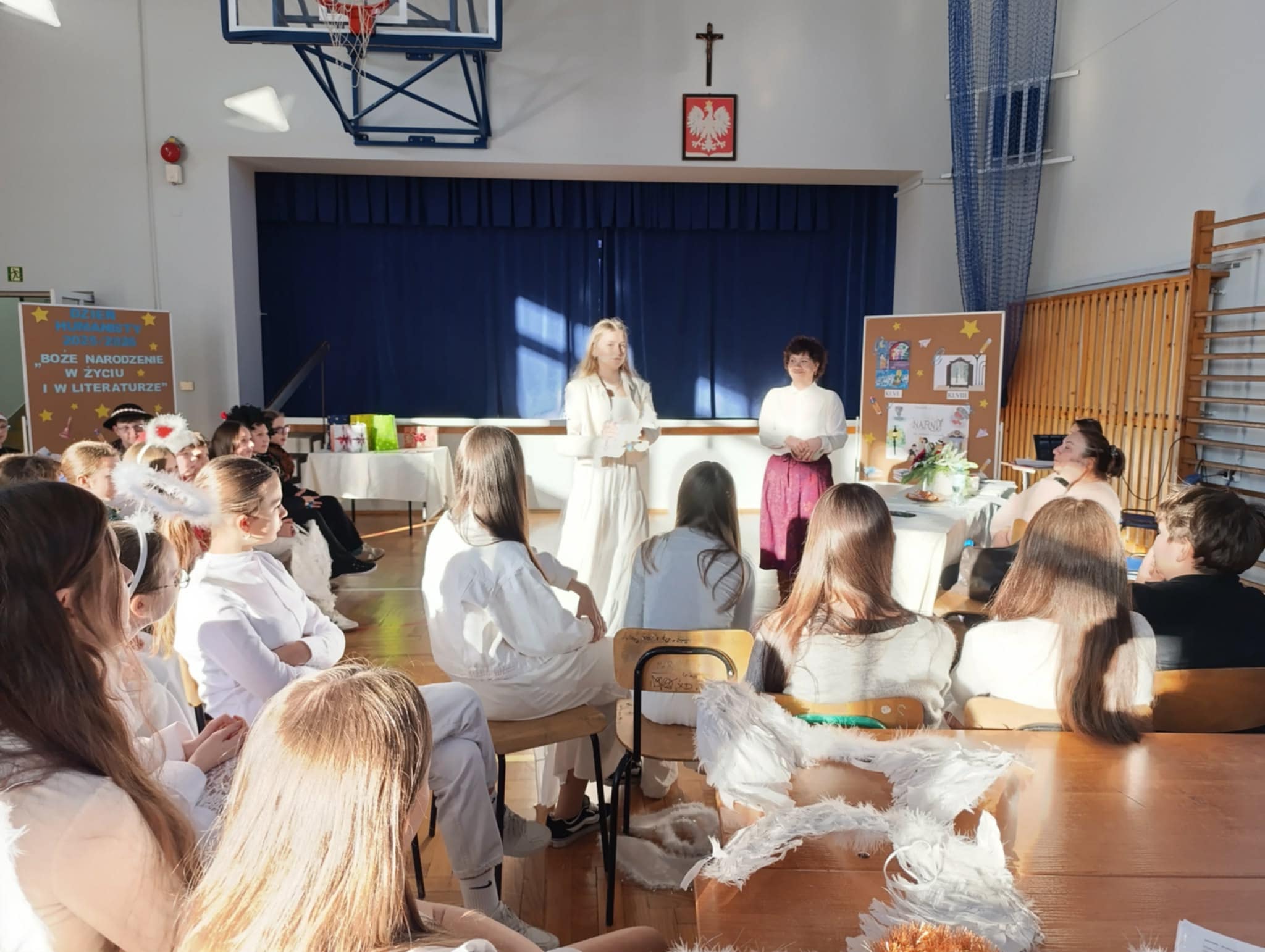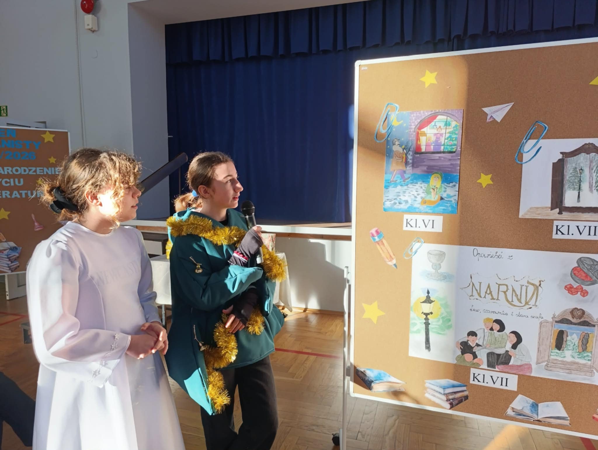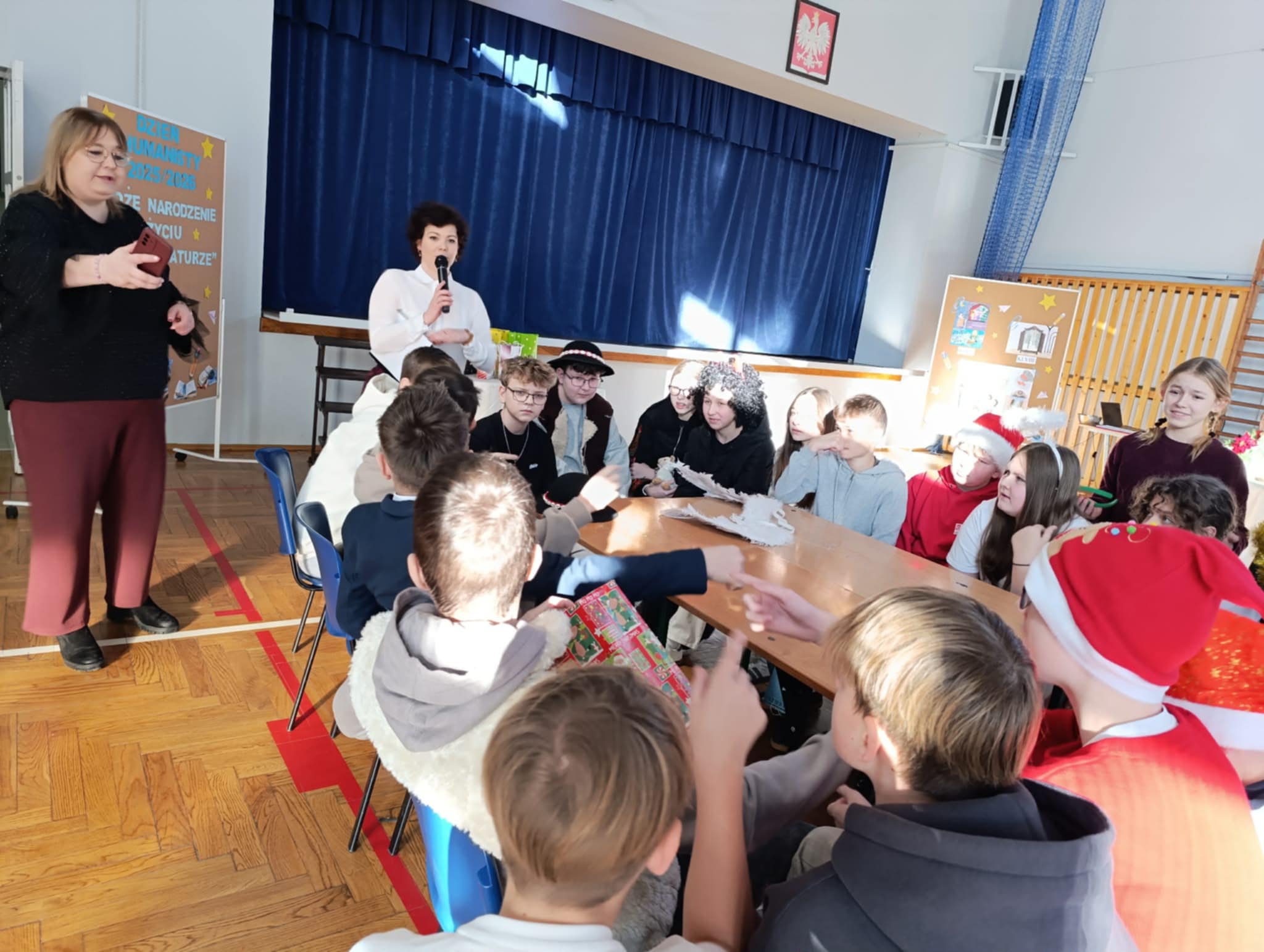 Ideą Dnia Humanisty jest przede wszystkim kształtowanie wrażliwości humanistycznej, budowanie przywiązania do literatury i sztuki, a także rozwijanie zainteresowania książkami i lekturami szkolnymi. To czas, w którym uczniowie mogą inspirować się bohaterami literackimi, poszukiwać kreatywnych rozwiązań, pobudzać wyobraźnię oraz odkrywać różnorodne formy artystycznego wyrazu. Ważnym elementem tego dnia jest również kultywowanie chrześcijańskich tradycji bożonarodzeniowych, które sprzyjają refleksji, wspólnemu przeżywaniu wartości oraz budowaniu wspólnoty szkolnej. Podczas tegorocznego Dnia Humanisty uczniowie klas 6, 7 i 8 zmierzyli się z różnorodnymi konkurencjami inspirowanymi znanymi i cenionymi lekturami: „Dziewczyną z zapałkami” H. Ch. Andersena, „Opowieściami z Narnii” C. S. Lewisa oraz „Opowieścią wigilijną” Ch. Dickensa. Każda z klas musiała wykazać się nie tylko znajomością treści utworów, ale również kreatywnością, pomysłowością i umiejętnością pracy zespołowej. W ramach przygotowań uczniowie zadbali o świąteczne przebrania, wykonali plakaty nawiązujące do wybranych lektur, a także przygotowali występy teatralne, w których w ciekawy sposób uwspółcześnili przesłanie literackich dzieł, pokazując, że poruszane w nich wartości są nadal aktualne. Nie zabrakło również elementu rywalizacji – klasy brały udział w quizie wiedzy z lektur, świątecznym dyktandzie, bożonarodzeniowych kalamburach, a także zaprezentowały wywiady dotyczące tradycji bożonarodzeniowych – z przedstawicielami starszego pokolenia – babciami i dziadkami, wytypowanymi przez poszczególne klasy. Goście w nagraniach z wielkim zaangażowaniem dzielili się swoimi wspomnieniami i doświadczeniami związanymi z obchodami Świąt Bożego Narodzenia, przybliżając uczniom dawne zwyczaje, rodzinne tradycje oraz atmosferę świąt sprzed lat. Wszyscy uczestnicy Dnia Humanisty zasługują na ogromne uznanie i gratulacje. Każda z klas zaprezentowała się w sposób imponujący, wykazując się dużą wiedzą na temat omawianych lektur, kreatywnością oraz zaangażowaniem. Uczniowie przygotowali wspaniałe występy teatralne, a podczas quizu wiedzy z lektur z ogromną determinacją i zapałem walczyli o kolejne punkty.