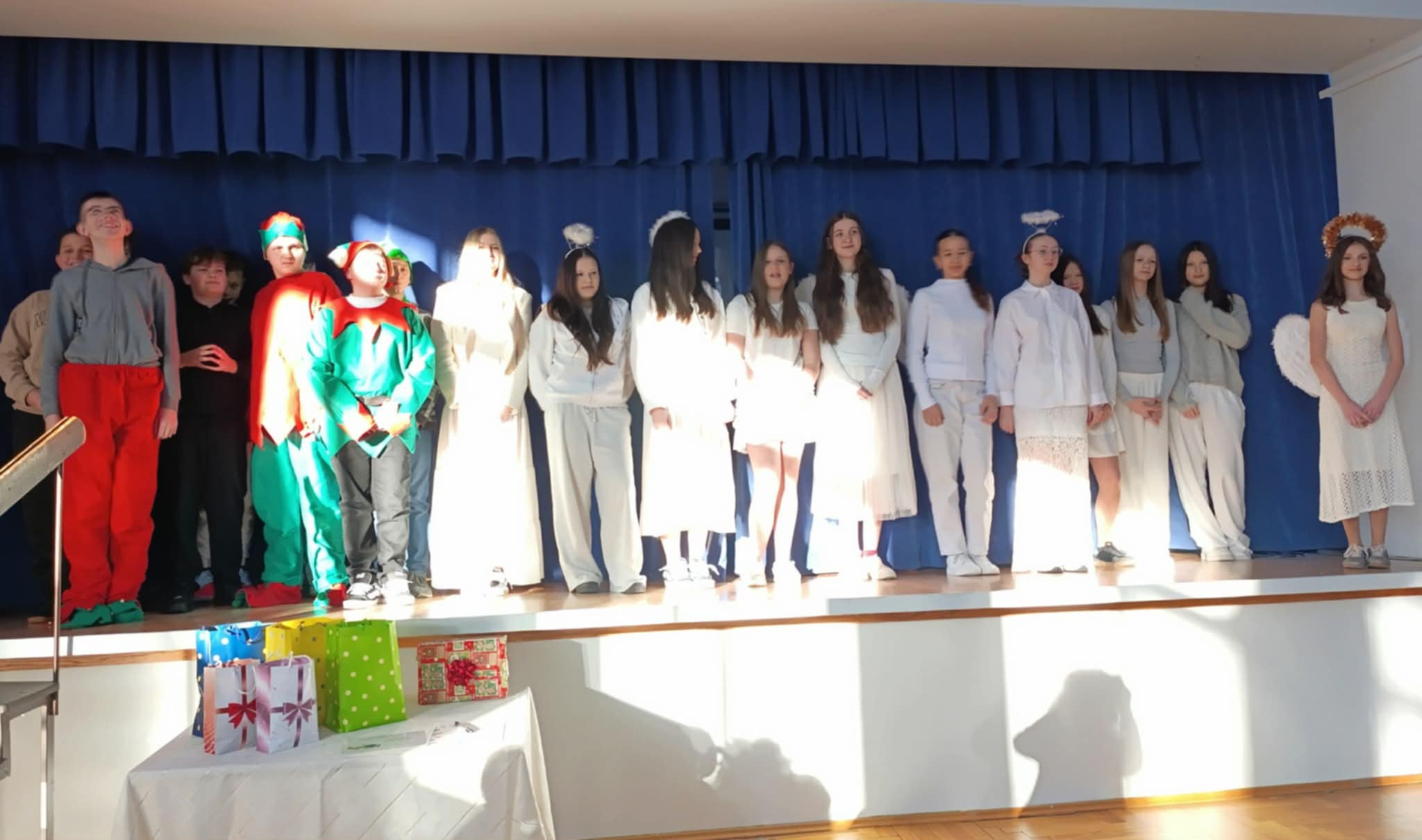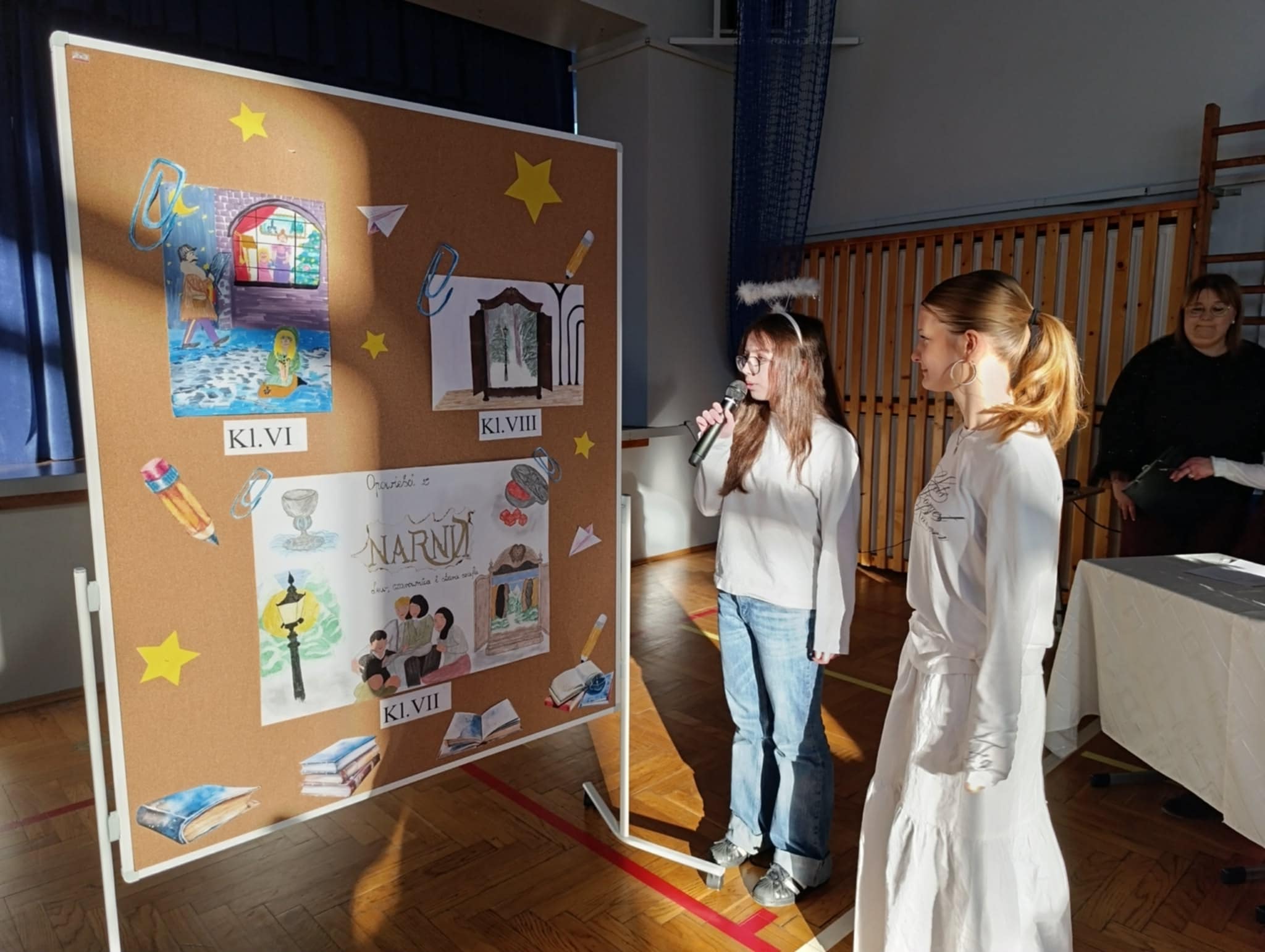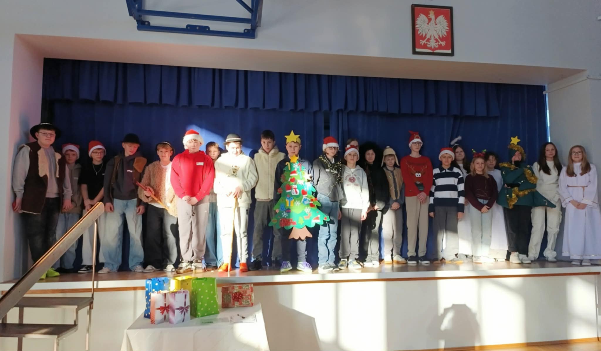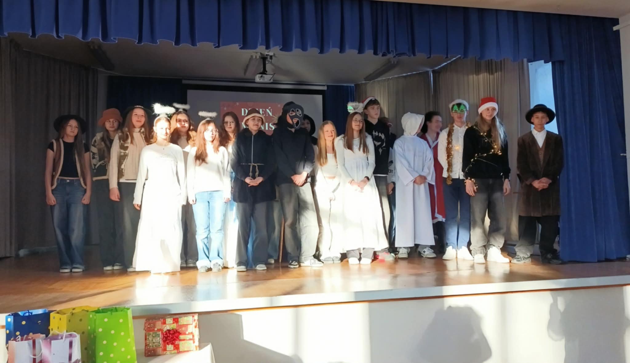 Ideą Dnia Humanisty jest przede wszystkim kształtowanie wrażliwości humanistycznej, budowanie przywiązania do literatury i sztuki, a także rozwijanie zainteresowania książkami i lekturami szkolnymi. To czas, w którym uczniowie mogą inspirować się bohaterami literackimi, poszukiwać kreatywnych rozwiązań, pobudzać wyobraźnię oraz odkrywać różnorodne formy artystycznego wyrazu. Ważnym elementem tego dnia jest również kultywowanie chrześcijańskich tradycji bożonarodzeniowych, które sprzyjają refleksji, wspólnemu przeżywaniu wartości oraz budowaniu wspólnoty szkolnej. Podczas tegorocznego Dnia Humanisty uczniowie klas 6, 7 i 8 zmierzyli się z różnorodnymi konkurencjami inspirowanymi znanymi i cenionymi lekturami: „Dziewczyną z zapałkami” H. Ch. Andersena, „Opowieściami z Narnii” C. S. Lewisa oraz „Opowieścią wigilijną” Ch. Dickensa. Każda z klas musiała wykazać się nie tylko znajomością treści utworów, ale również kreatywnością, pomysłowością i umiejętnością pracy zespołowej. W ramach przygotowań uczniowie zadbali o świąteczne przebrania, wykonali plakaty nawiązujące do wybranych lektur, a także przygotowali występy teatralne, w których w ciekawy sposób uwspółcześnili przesłanie literackich dzieł, pokazując, że poruszane w nich wartości są nadal aktualne. Nie zabrakło również elementu rywalizacji – klasy brały udział w quizie wiedzy z lektur, świątecznym dyktandzie, bożonarodzeniowych kalamburach, a także zaprezentowały wywiady dotyczące tradycji bożonarodzeniowych – z przedstawicielami starszego pokolenia – babciami i dziadkami, wytypowanymi przez poszczególne klasy. Goście w nagraniach z wielkim zaangażowaniem dzielili się swoimi wspomnieniami i doświadczeniami związanymi z obchodami Świąt Bożego Narodzenia, przybliżając uczniom dawne zwyczaje, rodzinne tradycje oraz atmosferę świąt sprzed lat. Wszyscy uczestnicy Dnia Humanisty zasługują na ogromne uznanie i gratulacje. Każda z klas zaprezentowała się w sposób imponujący, wykazując się dużą wiedzą na temat omawianych lektur, kreatywnością oraz zaangażowaniem. Uczniowie przygotowali wspaniałe występy teatralne, a podczas quizu wiedzy z lektur z ogromną determinacją i zapałem walczyli o kolejne punkty.