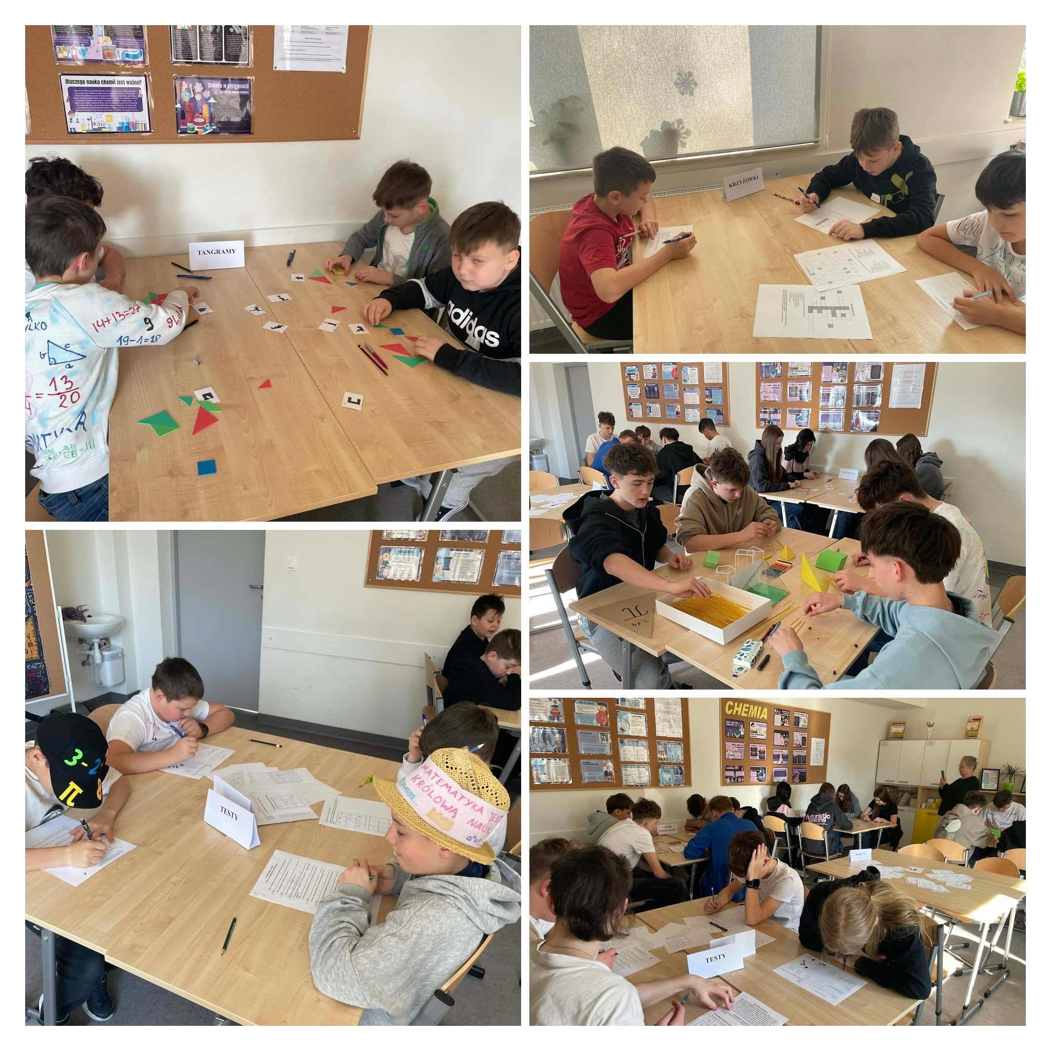 Do wykonania uczniowie mieli przygotowanych wiele ciekawych: zadań, krzyżówek, rebusów, wzorów do ułożenia z tangramów, tworzyli również szkielety brył. Oceniany był także element stroju nawiązujący treścią do matematyki, tu klasa IV wykazała się dużą inwencją.