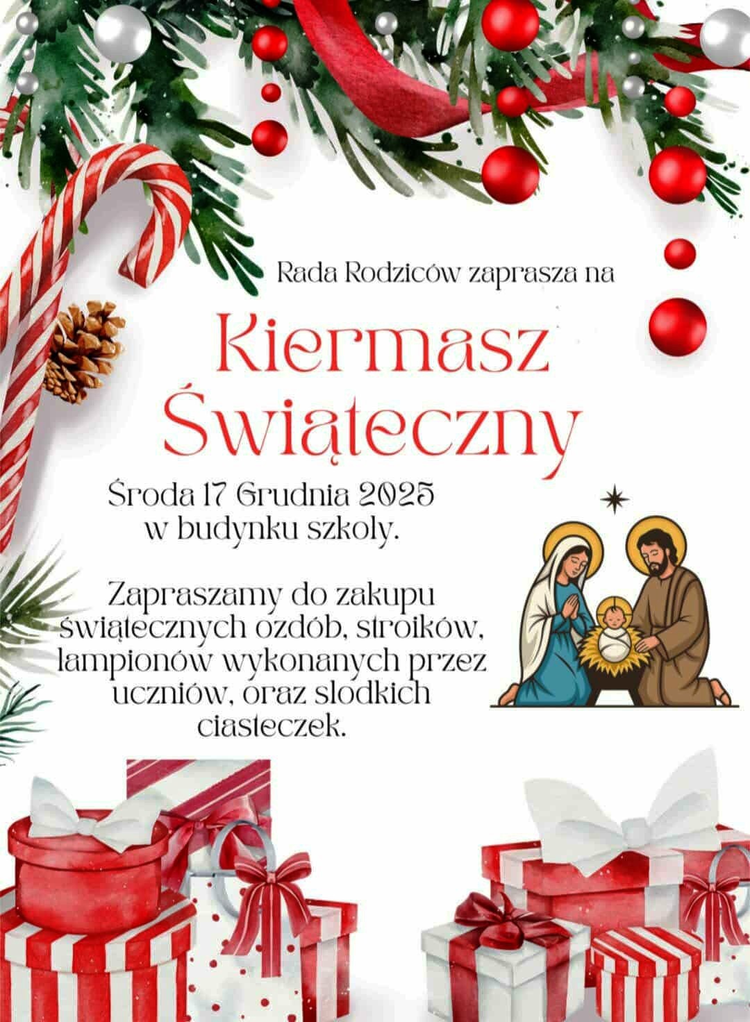 Rada Rodziców serdecznie zaprasza na KIERMASZ ŚWIĄTECZNY, który odbędzie się w naszej szkole 17 grudnia. Zapraszamy do zakupu świątecznych ozdób, stroików, lampionów, wykonanych przez naszych uczniów, oraz słodkich ciasteczek.