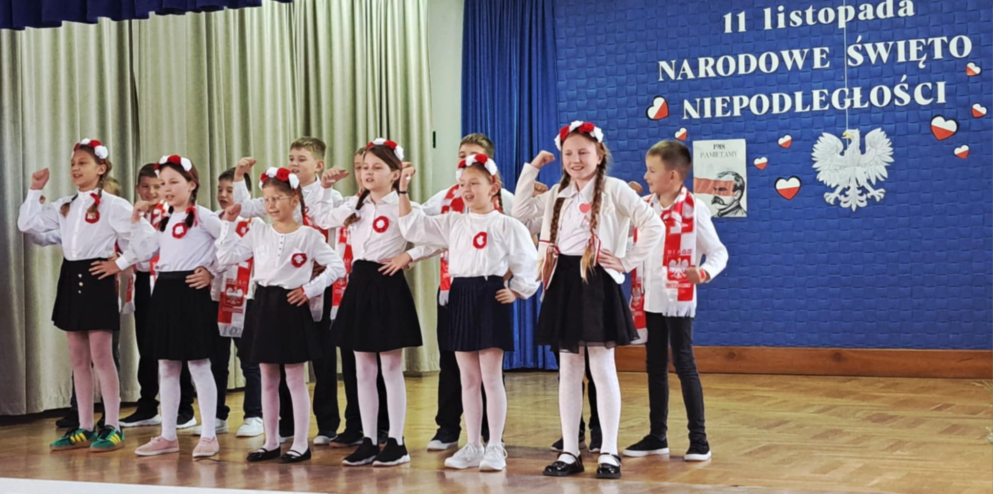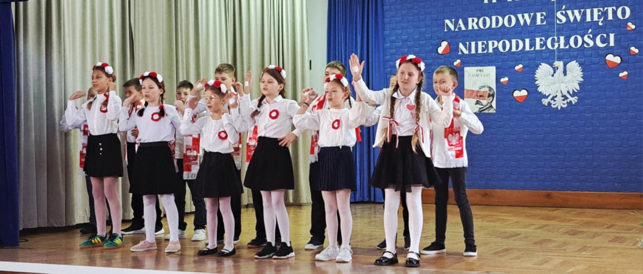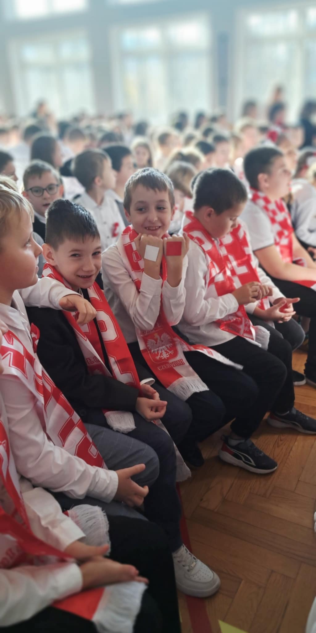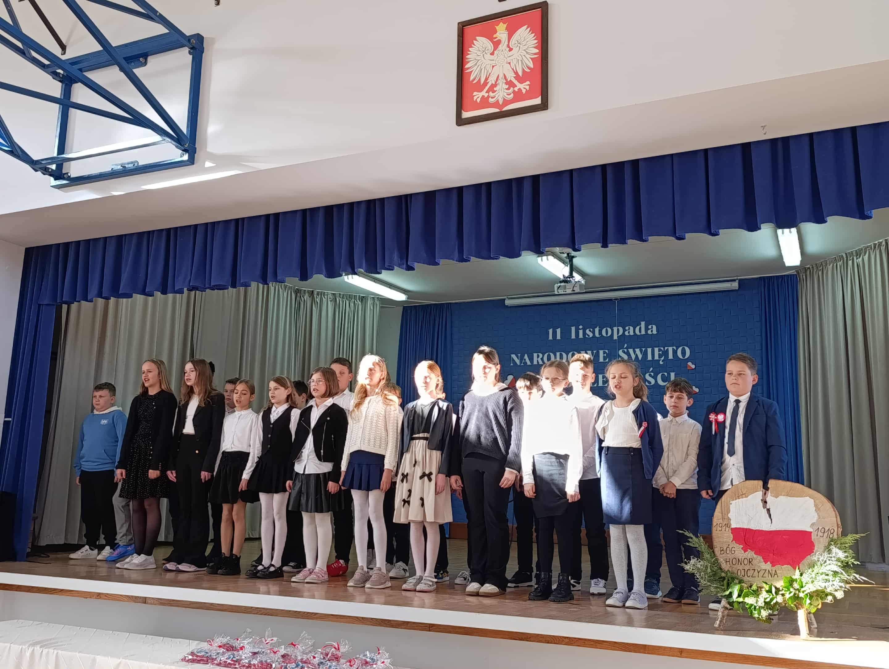 Narodowe Święto Niepodległości to dla Polaków jedno z najważniejszych świąt państwowych. Podczas corocznych obchodów tego święta czcimy pamięć tych, dzięki którym żyjemy dzisiaj w wolnej Polsce. Dnia 12 listopada społeczność naszej szkoły uczciła 107 rocznicę tego ważnego wydarzenia, spotykając się na sali gimnastycznej na koncercie pieśni patriotycznych „Zaśpiewajmy dla Niepodległej”. Uroczystość rozpoczęła się wykonaniem 4 zwrotek hymnu „Mazurek Dąbrowskiego” w ramach ogólnopolskiej akcji „Szkoła do hymnu”. Wspólne śpiewanie hymnu narodowego to nie tylko piękna tradycja, ale także ważna lekcja patriotyzmu, wyraz wspólnoty i tożsamości, szacunku dla symboli narodowych oraz dumy z bycia Polakami. Koncert otworzył występ uczennic z klasy 5 i 7, które wykonały wokalno- taneczną interpretację utworu „Wolność”. Na scenie pojawili się finaliści oraz uczestnicy szkolnego konkursu „Zaśpiewajmy dla Niepodległej. Nastąpiło wręczenie dyplomów i nagród, a także występy zwycięzców poszczególnych kategorii. Następnie na scenie prezentowały się klasy I- VIII, każda z przygotowaną piosenką, wprowadzając wszystkich w podniosły i radosny nastrój. Usłyszeliśmy między innymi: Legiony, Szarą Piechotę, Jesteśmy Polką i Polakiem, Godzina W, Ojczyzno ma. Uczniowie ubrani byli odświętnie- nie zabrakło też biało-czerwonych atrybutów: kokard narodowych, flag i kwiatów, co podkreślało patriotyczny charakter wydarzenia. Było uroczyście, wzruszająco i naprawdę wyjątkowo!