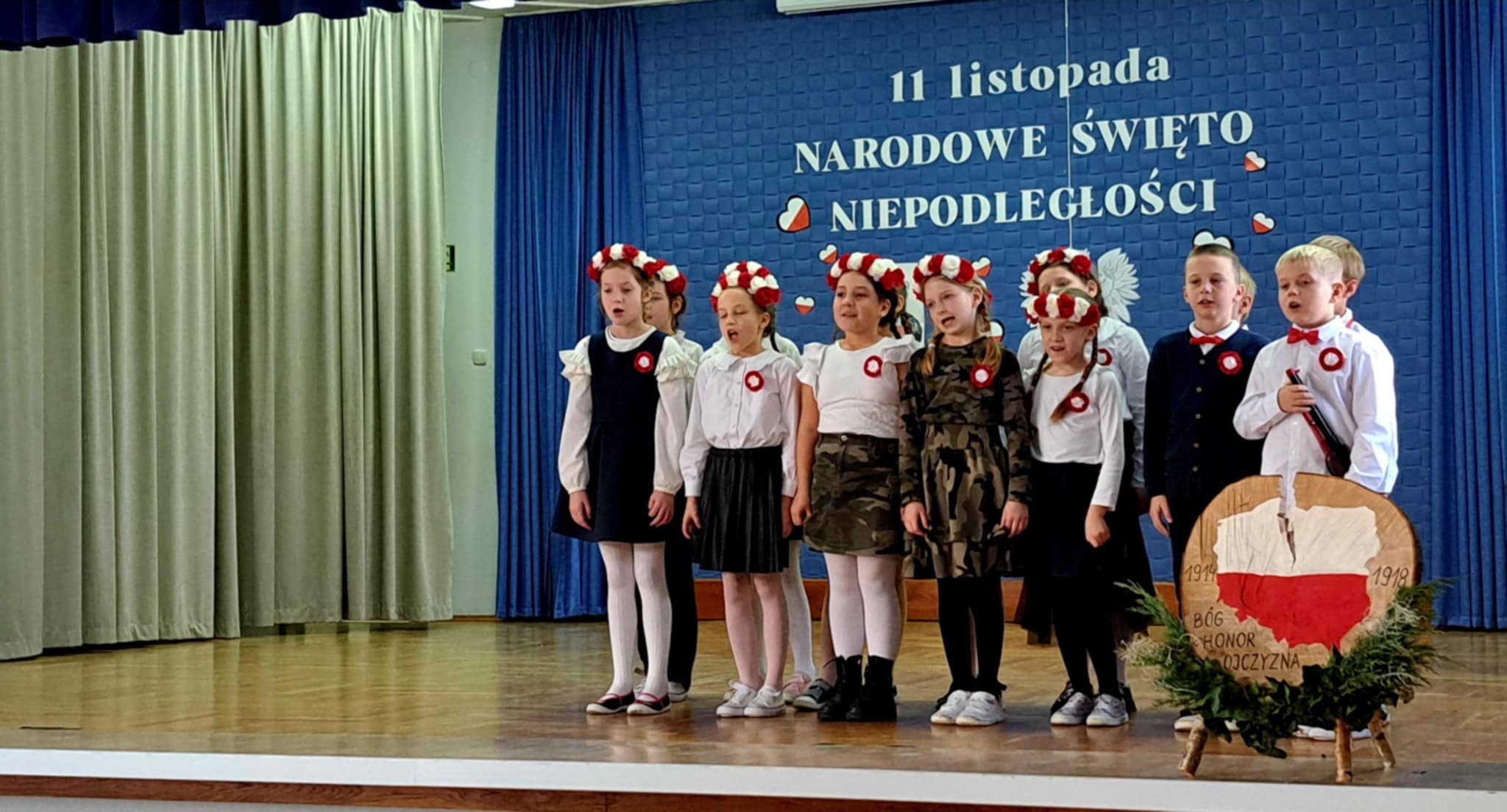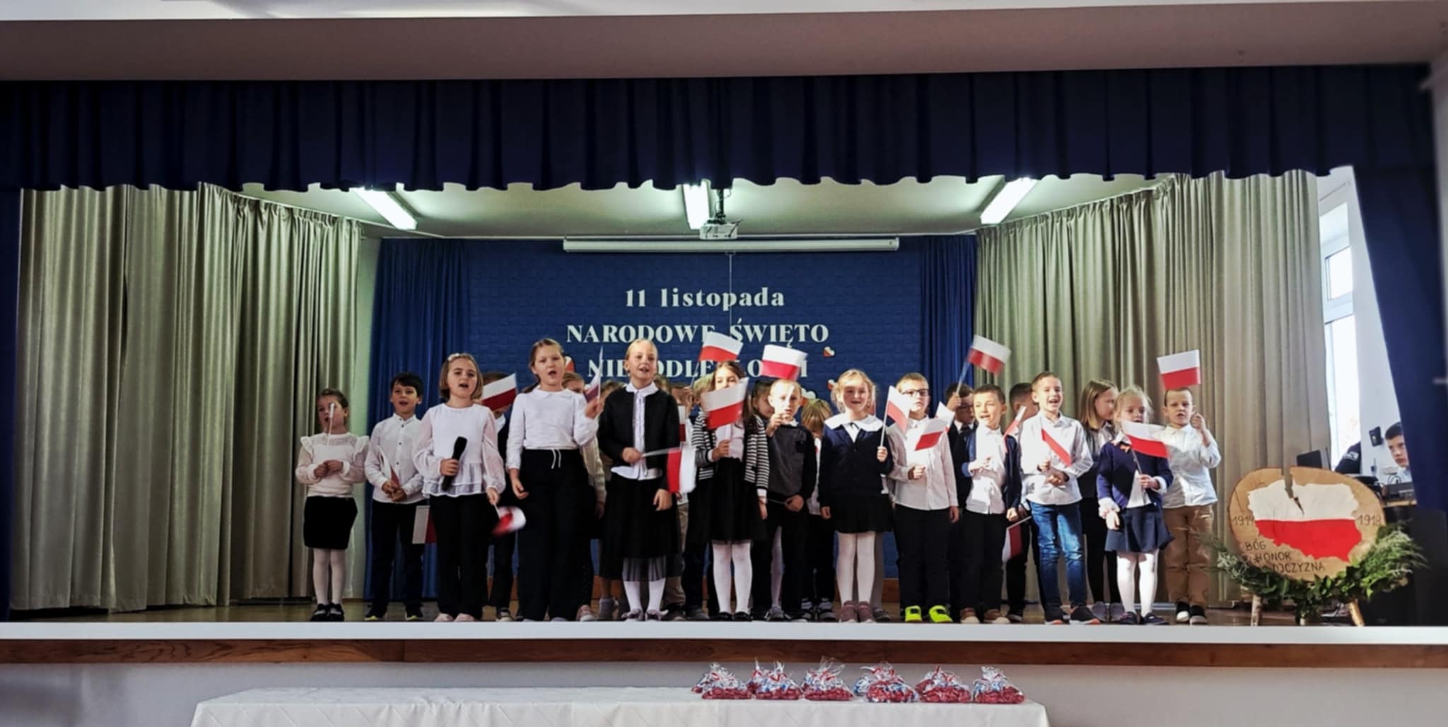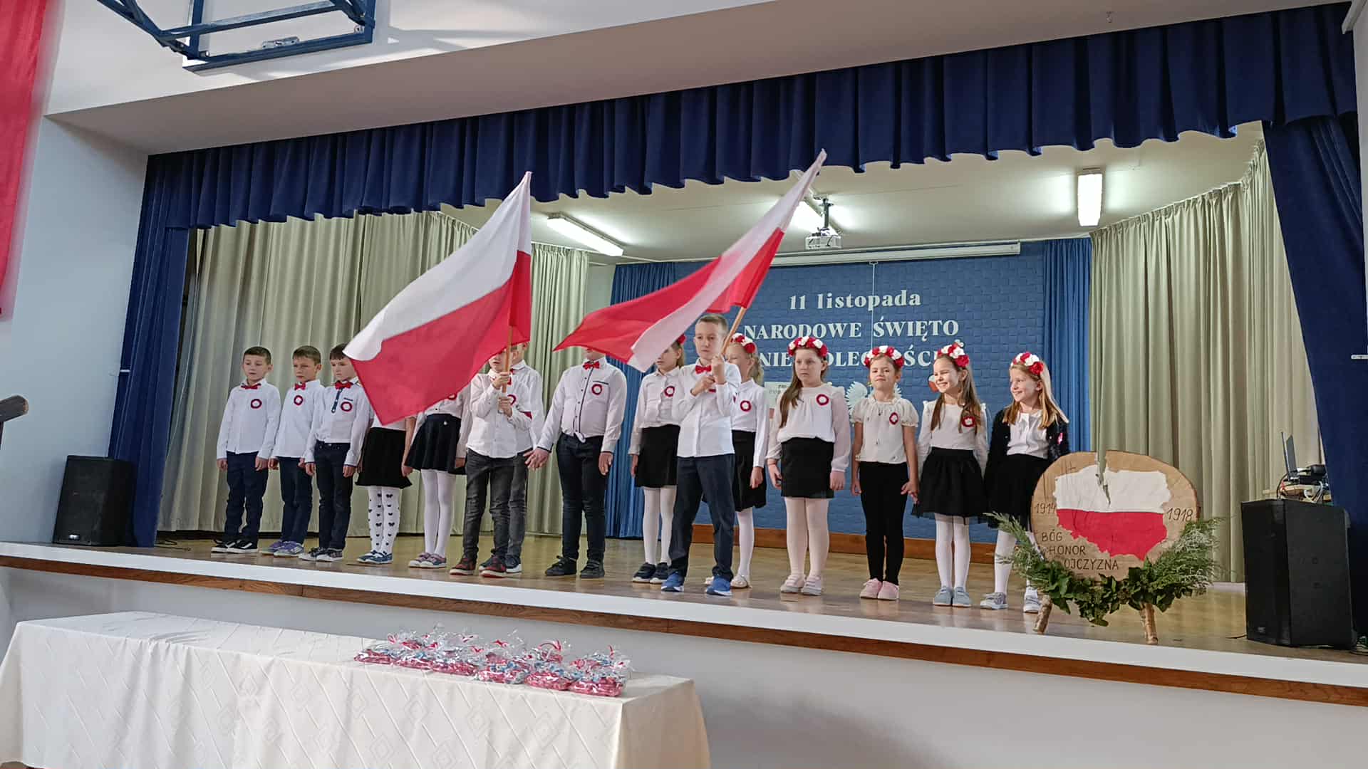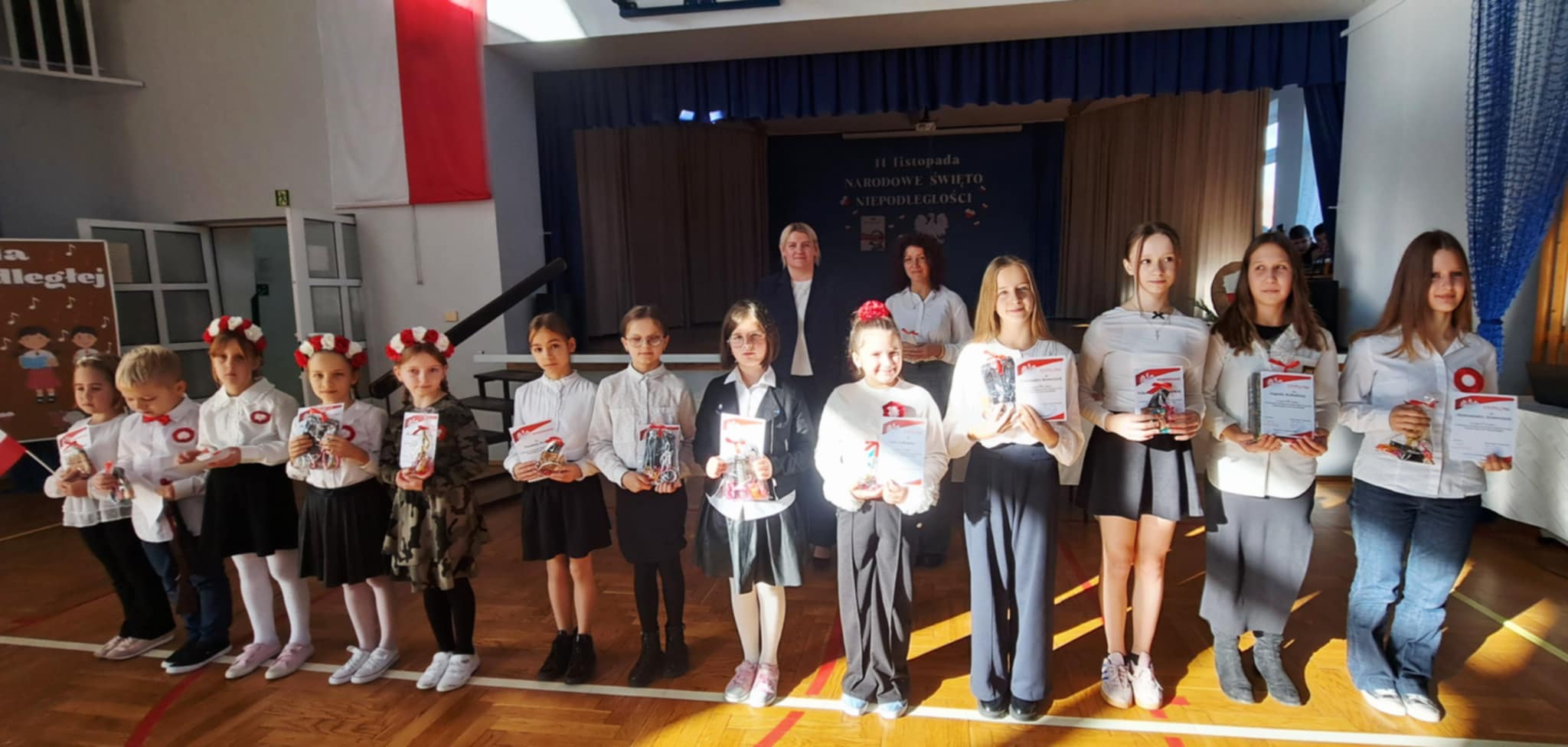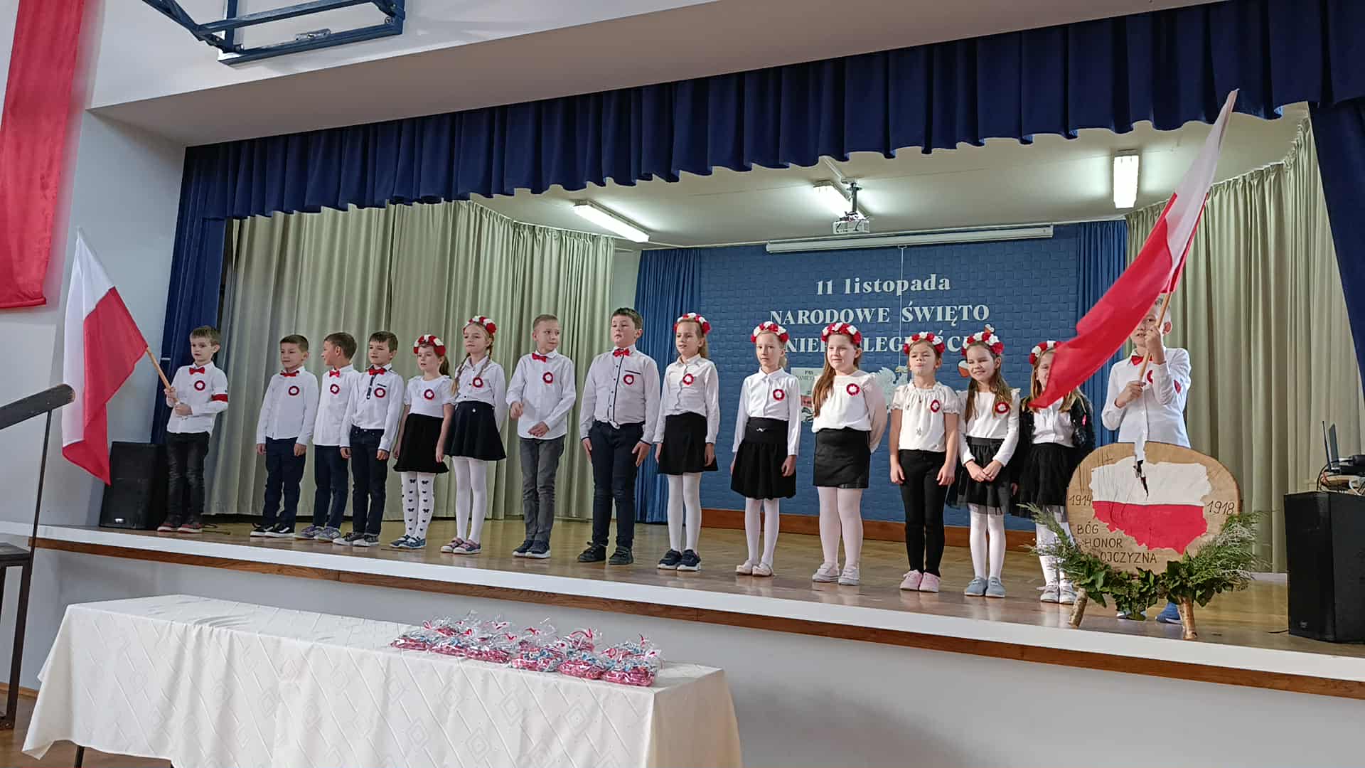 Narodowe Święto Niepodległości to dla Polaków jedno z najważniejszych świąt państwowych. Podczas corocznych obchodów tego święta czcimy pamięć tych, dzięki którym żyjemy dzisiaj w wolnej Polsce. Dnia 12 listopada społeczność naszej szkoły uczciła 107 rocznicę tego ważnego wydarzenia, spotykając się na sali gimnastycznej na koncercie pieśni patriotycznych „Zaśpiewajmy dla Niepodległej”. Uroczystość rozpoczęła się wykonaniem 4 zwrotek hymnu „Mazurek Dąbrowskiego” w ramach ogólnopolskiej akcji „Szkoła do hymnu”. Wspólne śpiewanie hymnu narodowego to nie tylko piękna tradycja, ale także ważna lekcja patriotyzmu, wyraz wspólnoty i tożsamości, szacunku dla symboli narodowych oraz dumy z bycia Polakami. Koncert otworzył występ uczennic z klasy 5 i 7, które wykonały wokalno- taneczną interpretację utworu „Wolność”. Na scenie pojawili się finaliści oraz uczestnicy szkolnego konkursu „Zaśpiewajmy dla Niepodległej. Nastąpiło wręczenie dyplomów i nagród, a także występy zwycięzców poszczególnych kategorii. Następnie na scenie prezentowały się klasy I- VIII, każda z przygotowaną piosenką, wprowadzając wszystkich w podniosły i radosny nastrój. Usłyszeliśmy między innymi: Legiony, Szarą Piechotę, Jesteśmy Polką i Polakiem, Godzina W, Ojczyzno ma. Uczniowie ubrani byli odświętnie- nie zabrakło też biało-czerwonych atrybutów: kokard narodowych, flag i kwiatów, co podkreślało patriotyczny charakter wydarzenia. Było uroczyście, wzruszająco i naprawdę wyjątkowo!