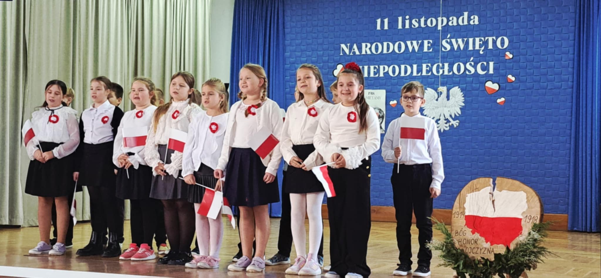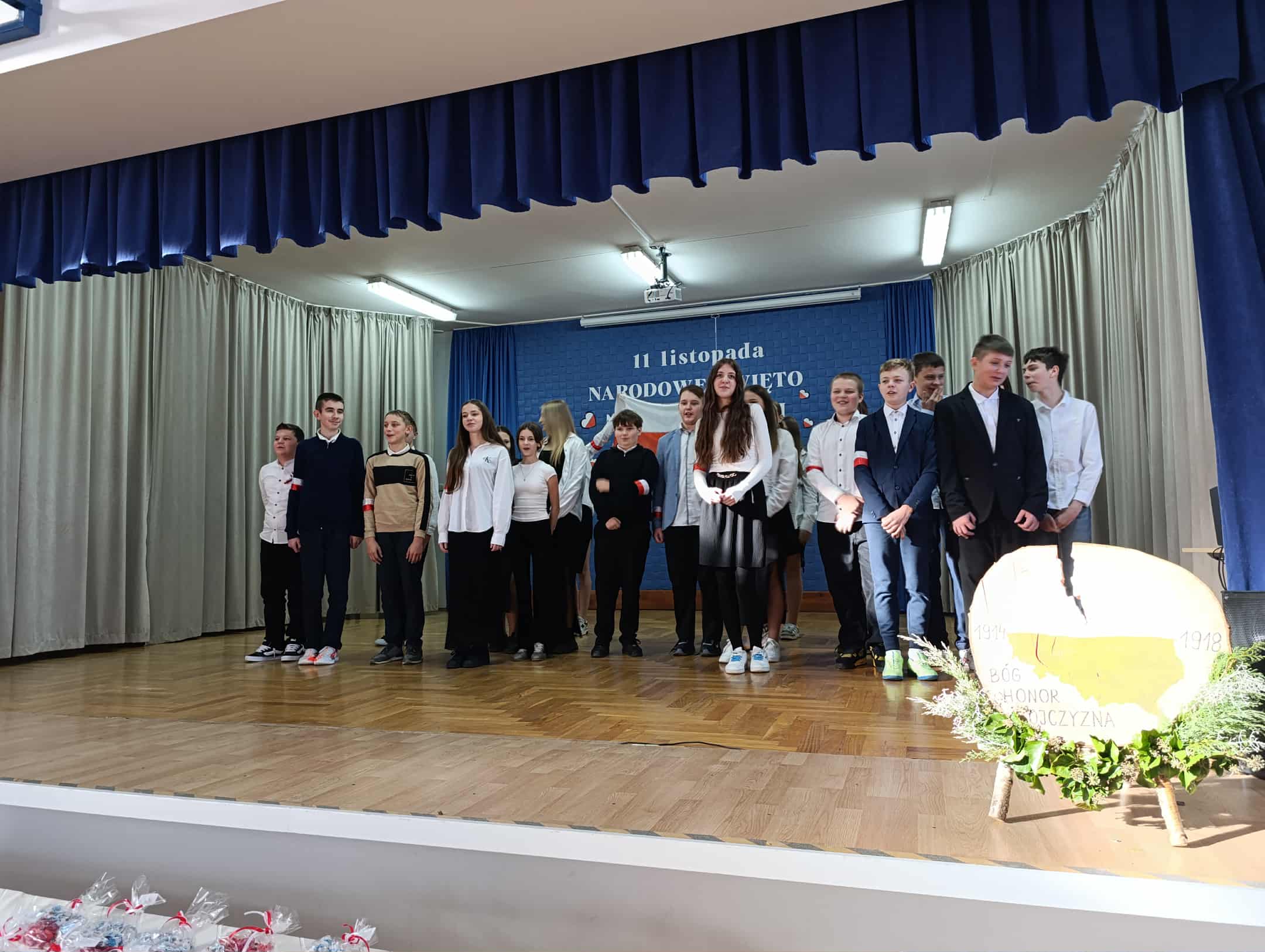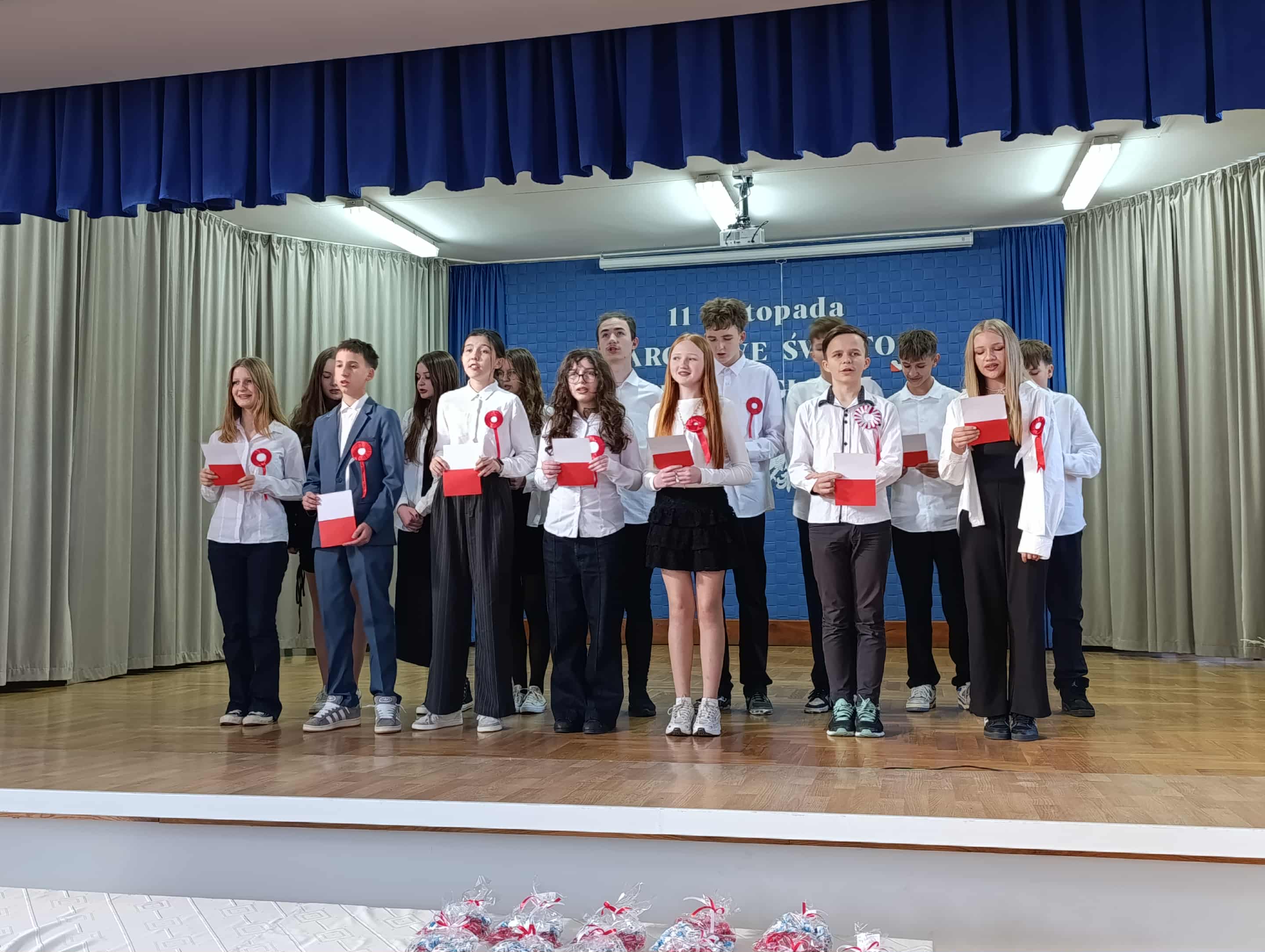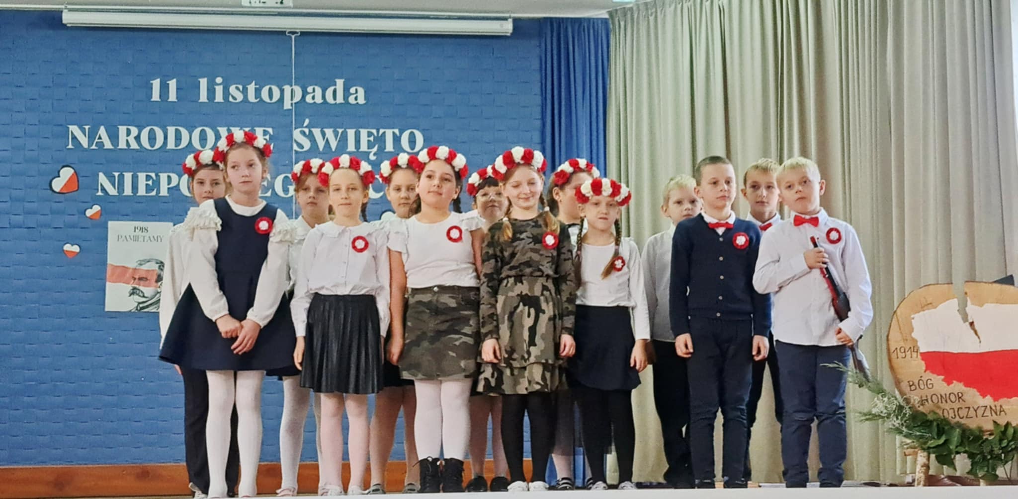 Narodowe Święto Niepodległości to dla Polaków jedno z najważniejszych świąt państwowych. Podczas corocznych obchodów tego święta czcimy pamięć tych, dzięki którym żyjemy dzisiaj w wolnej Polsce. Dnia 12 listopada społeczność naszej szkoły uczciła 107 rocznicę tego ważnego wydarzenia, spotykając się na sali gimnastycznej na koncercie pieśni patriotycznych „Zaśpiewajmy dla Niepodległej”. Uroczystość rozpoczęła się wykonaniem 4 zwrotek hymnu „Mazurek Dąbrowskiego” w ramach ogólnopolskiej akcji „Szkoła do hymnu”. Wspólne śpiewanie hymnu narodowego to nie tylko piękna tradycja, ale także ważna lekcja patriotyzmu, wyraz wspólnoty i tożsamości, szacunku dla symboli narodowych oraz dumy z bycia Polakami. Koncert otworzył występ uczennic z klasy 5 i 7, które wykonały wokalno- taneczną interpretację utworu „Wolność”. Na scenie pojawili się finaliści oraz uczestnicy szkolnego konkursu „Zaśpiewajmy dla Niepodległej. Nastąpiło wręczenie dyplomów i nagród, a także występy zwycięzców poszczególnych kategorii. Następnie na scenie prezentowały się klasy I- VIII, każda z przygotowaną piosenką, wprowadzając wszystkich w podniosły i radosny nastrój. Usłyszeliśmy między innymi: Legiony, Szarą Piechotę, Jesteśmy Polką i Polakiem, Godzina W, Ojczyzno ma. Uczniowie ubrani byli odświętnie- nie zabrakło też biało-czerwonych atrybutów: kokard narodowych, flag i kwiatów, co podkreślało patriotyczny charakter wydarzenia. Było uroczyście, wzruszająco i naprawdę wyjątkowo!