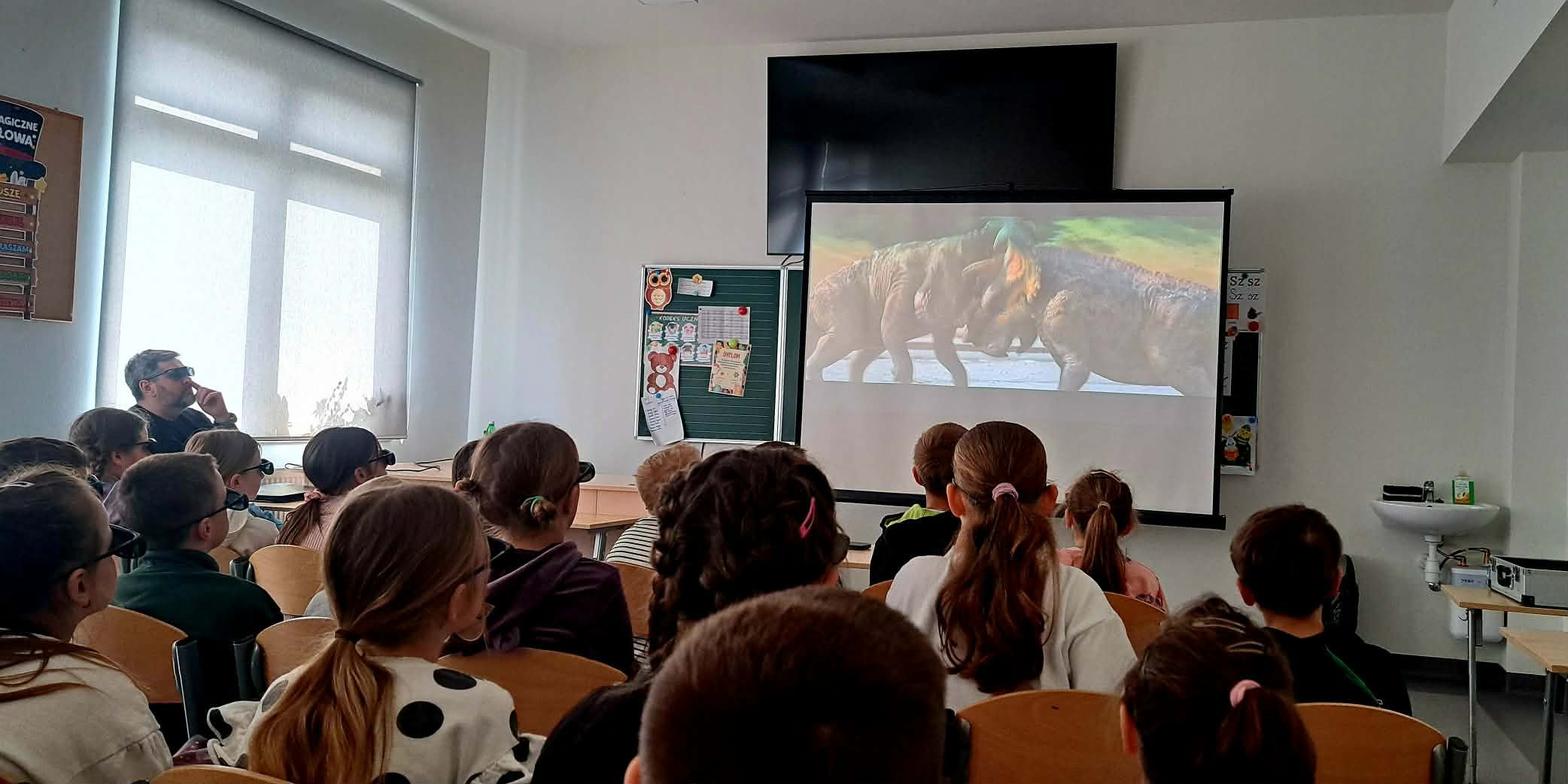 10 kwietnia uczniowie klas 1-3 wyruszyli w niesamowitą podróż w czasie, która przeniosła ich miliony lat wstecz – prosto do ery dinozaurów! Wszystko to za sprawą mobilnego kina 3D, które odwiedziło naszą szkołę, zamieniając salę lekcyjną w prehistoryczną dżunglę.