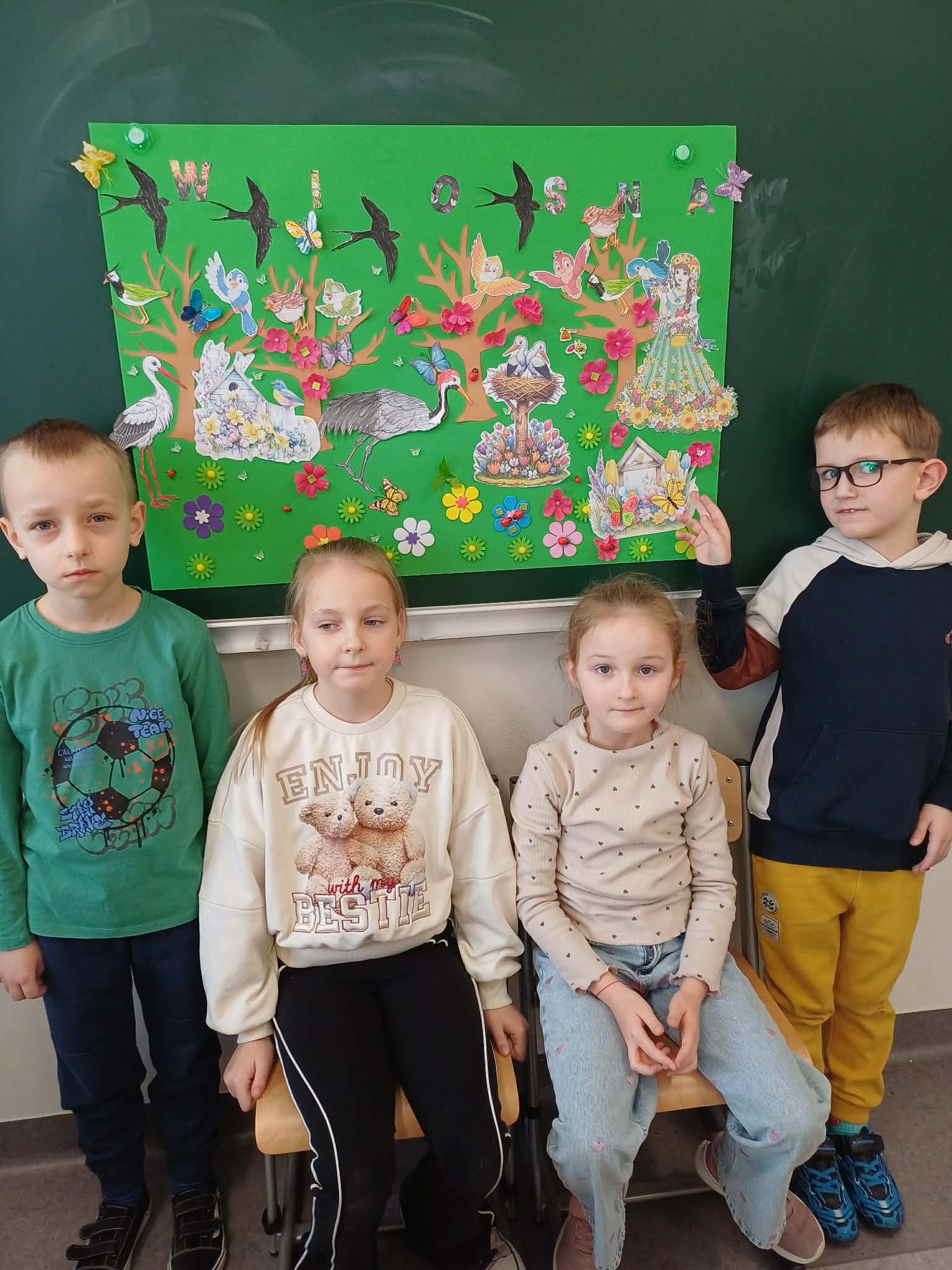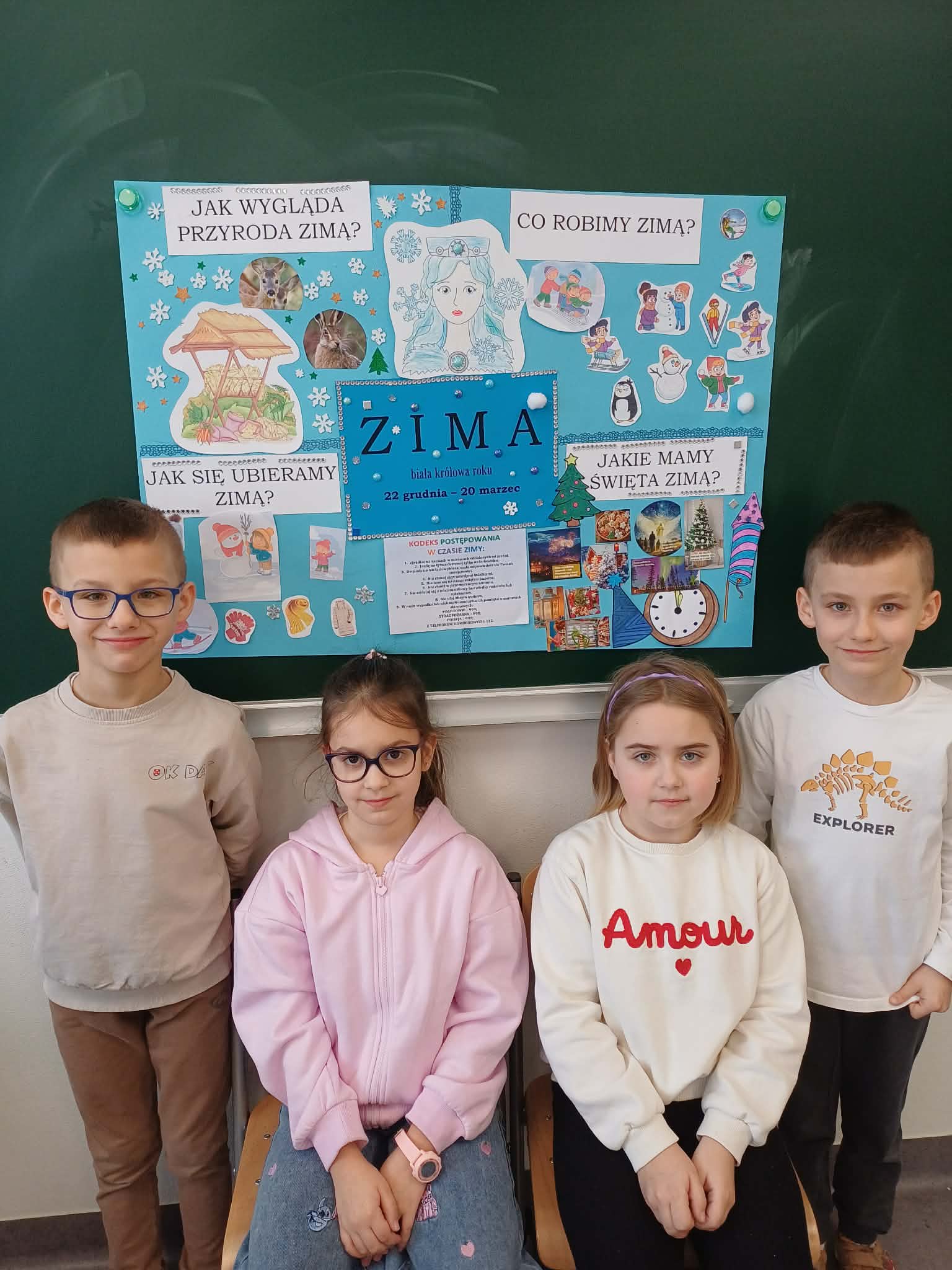Uczniowie klasy 1a w ramach swoich zajęć uczestniczyli w projekcie edukacyjnym pod tytułem: ,,Cztery pory roku”. W trakcie omawiania tematów dotyczących kalendarza poznali poszczególne dni tygodnia, miesiące i pory roku. Dzieląc klasę na 4 zespoły, wychowawca zapoznał uczniów na czym polega praca grupowa nad projektem. Wspólnie ustaliliśmy zasady naszej współpracy.