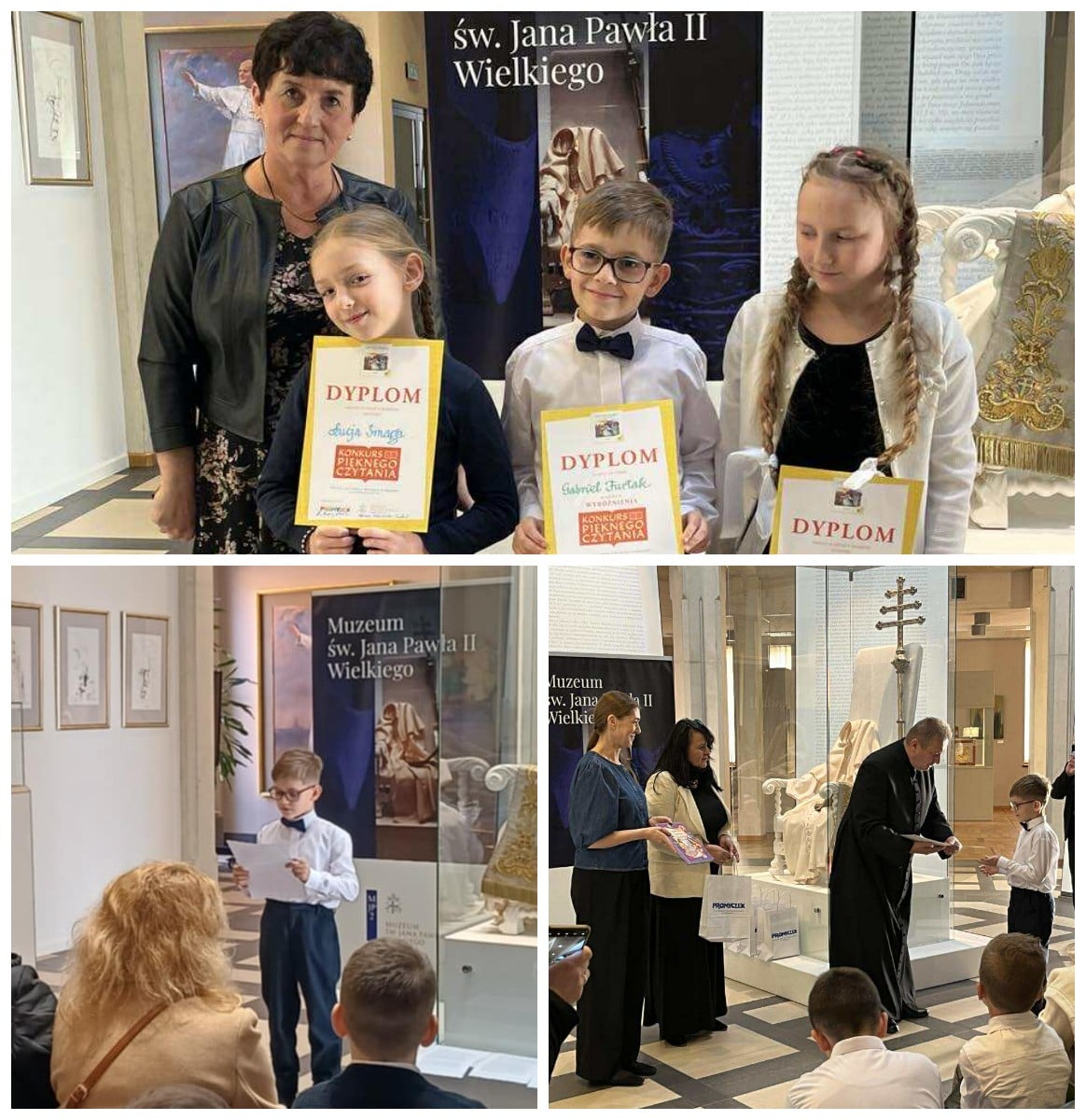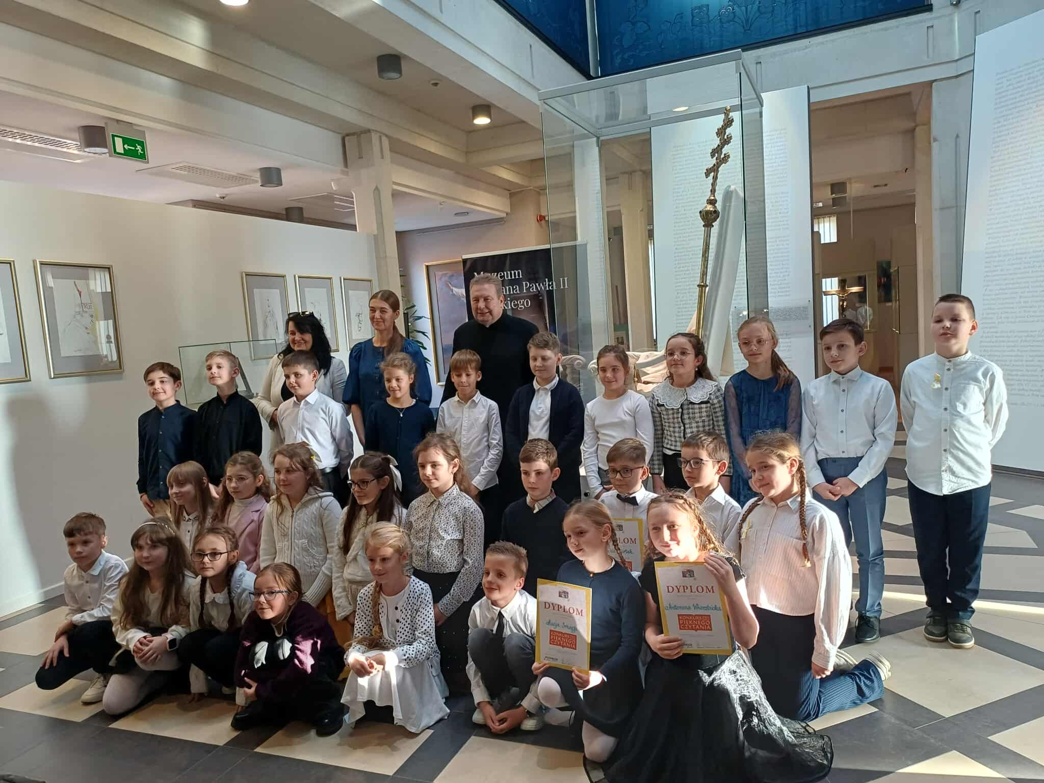 14 listopada troje uczniów z klas III- Łucja Smaga, Antonina Wierzbicka i Gabriel Furtak , którzy zwyciężyli w szkolnym etapie, udali się pod opieką p. Teresy Białki i rodziców na finał II Konkursu Pięknego Czytania, która jak w ubiegłym roku odbywała się w Centrum Jana Pawła II w Krakowie, a dokładnie w Muzeum św. Jana Pawła II w Krakowie. Organizatorem Konkursu było Wydawnictwo „ Promyczek”. Po Mszy św. w kaplicy kapłańskiej i krótkim zwiedzeniu Sanktuarium, uczestnicy przeszli do Muzeum, gdzie w auli rozpoczął się konkurs . Dzieci losowały numery fragmentów listu Jana Pawła II do dzieci i przez minutę odczytywały wskazany fragment. W czasie obrad jury, dzieci oglądały film „ Dzisiaj w Betlejem”, zwiedzały muzeum i wykonywały kartki w formie kolażu z wizerunkiem św. Jana Pawła II. Po naradzie ogłoszono wyniki. Wszyscy otrzymali ciekawe upominki i dyplomy. Uczeń naszej szkoły Gabriel Furtak z klasy III a znalazł się wśród laureatów, zdobywając wyróżnienie.