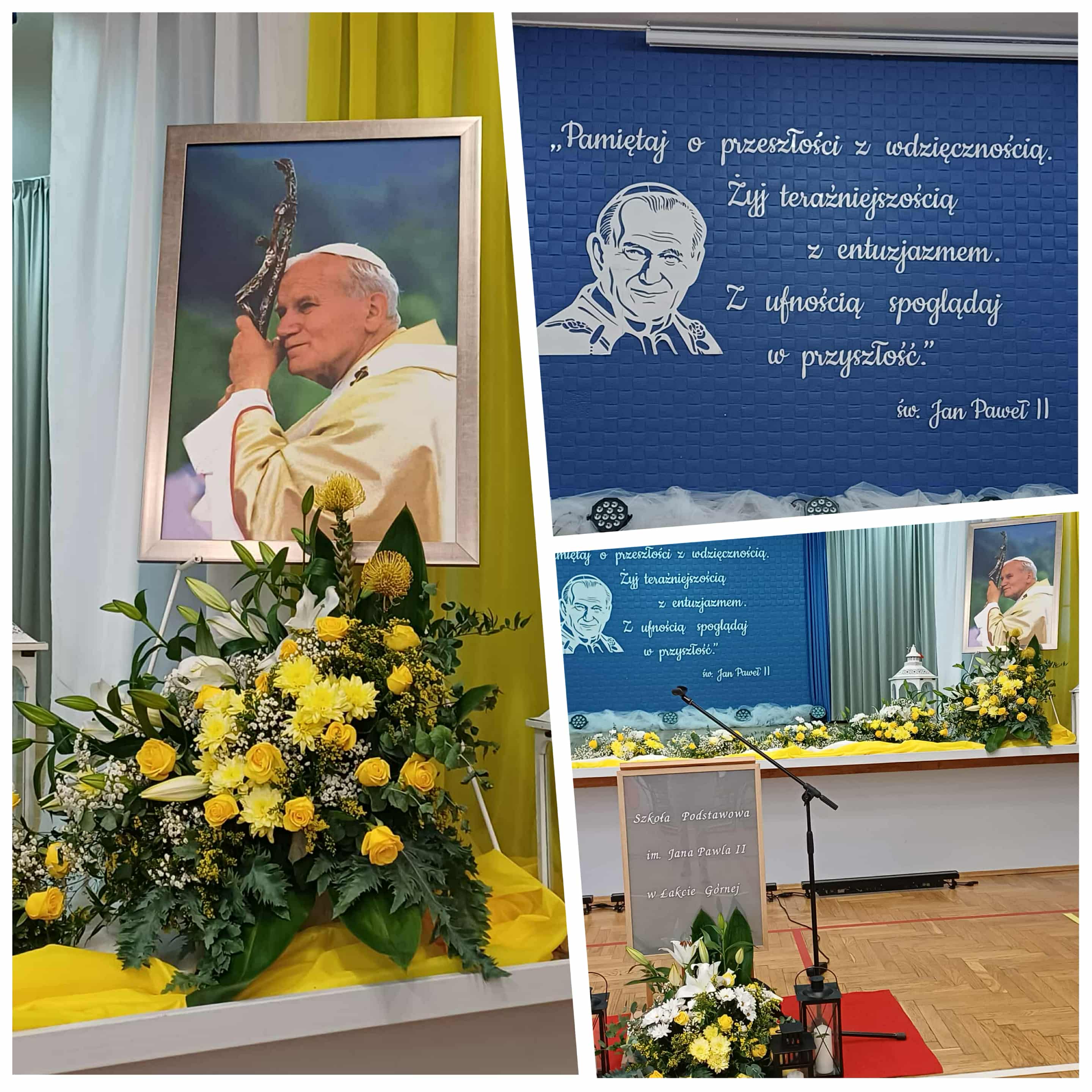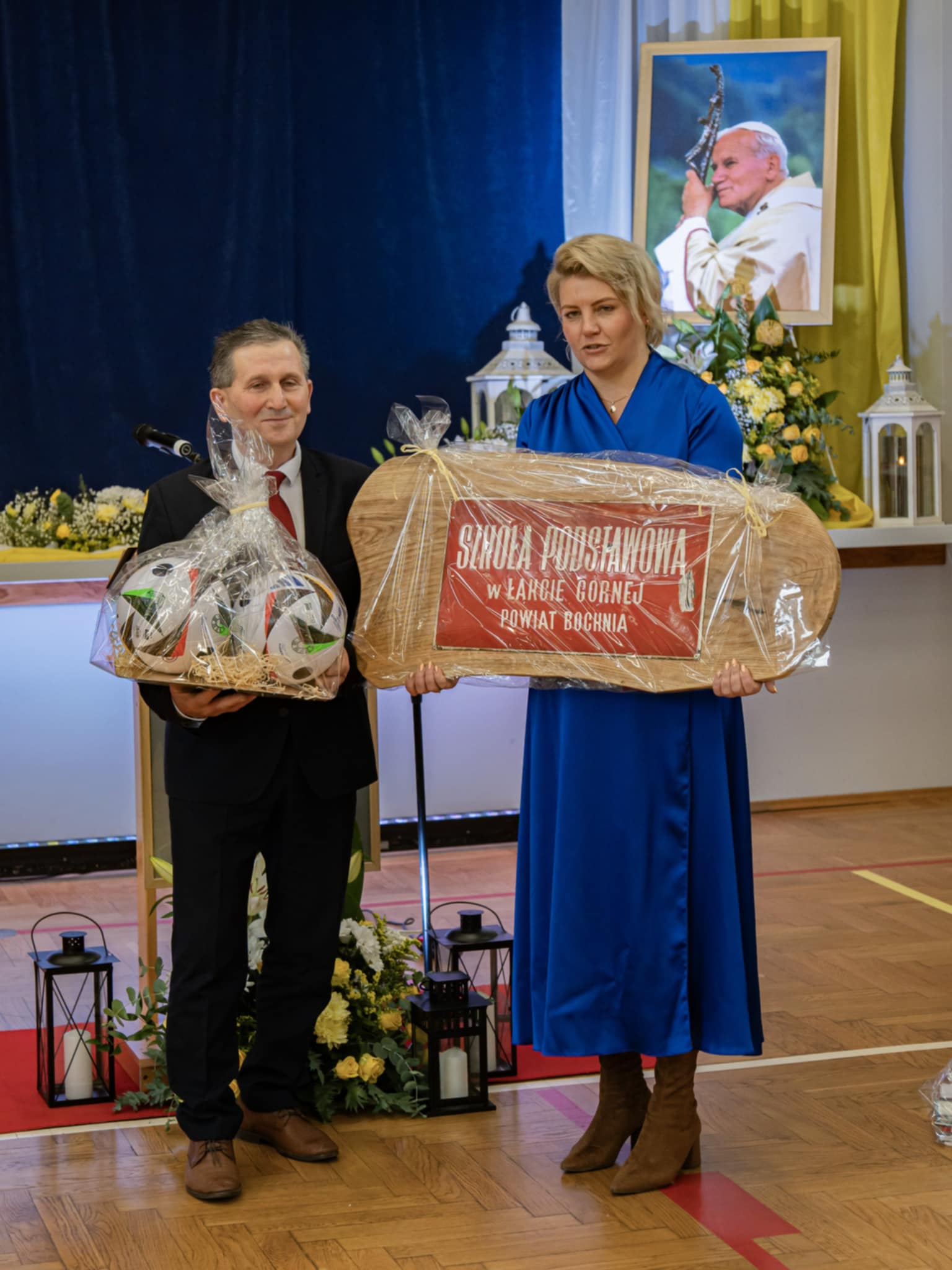 Podczas uroczystości wręczono również nagrody laureatom konkursu plastycznego pt. „Obraz z Janem Pawłem II i naszą nową szkołą oraz łąkiecką okolicą”. Nagrody wręczyły: pani Gabriela Olszowska – Małopolska Kurator Oświaty, pani Dorota Juszczyk – Dyrektor Szkoły oraz pani Teresa Białka – organizatorka konkursu. Konkurs ten był nie tylko okazją do rozwijania talentów artystycznych, ale także do refleksji nad wartościami, które głosił Patron szkoły - św. Jan Paweł II.