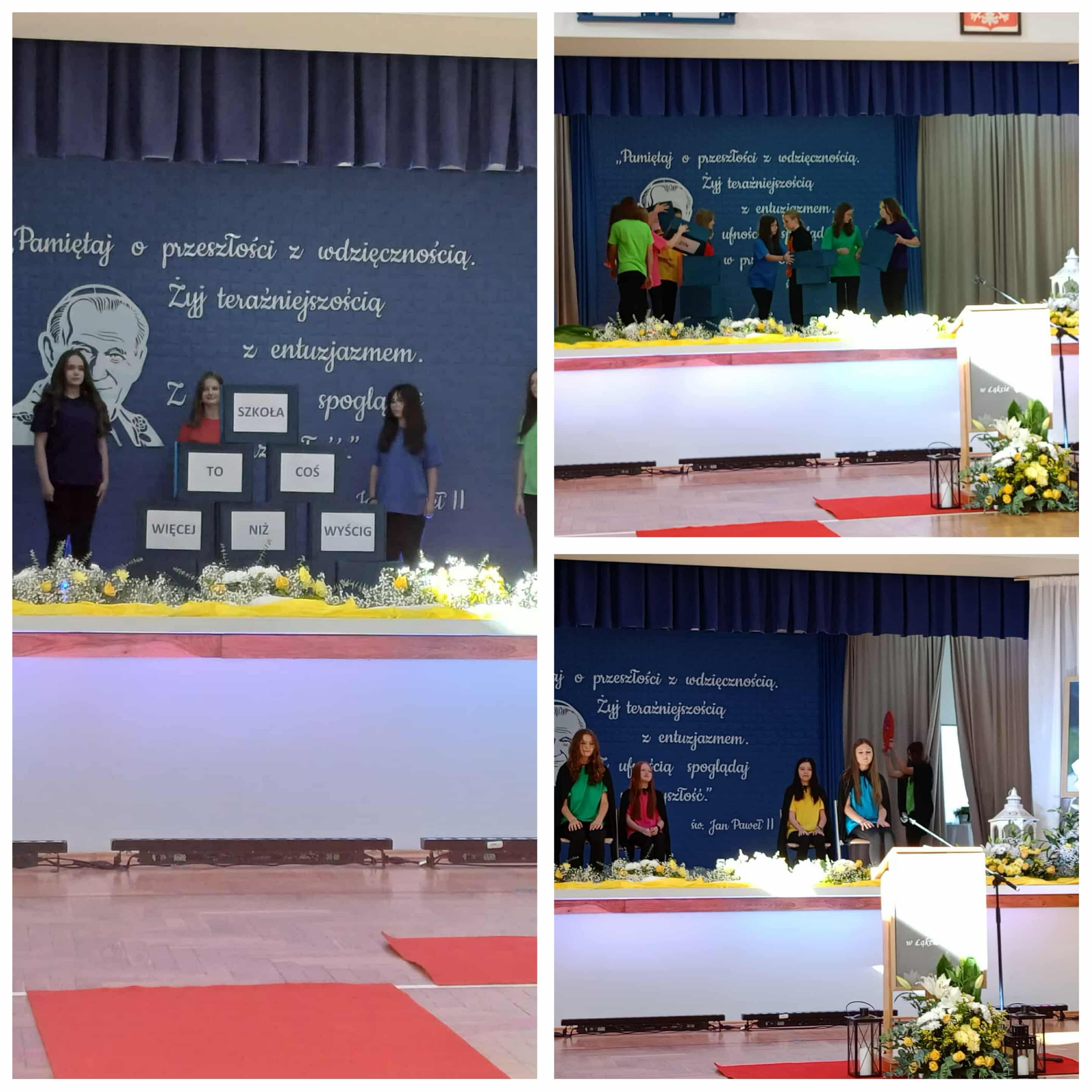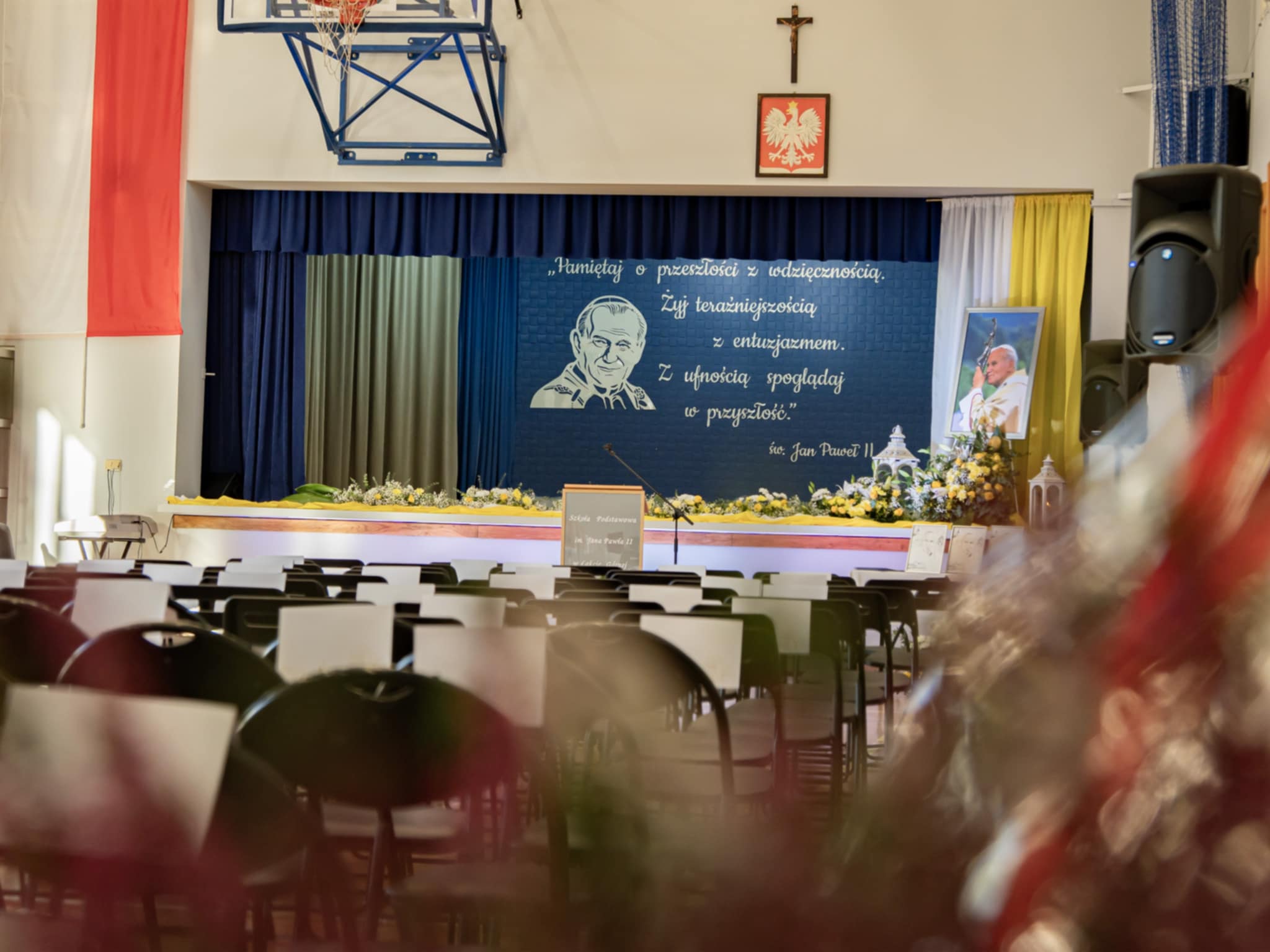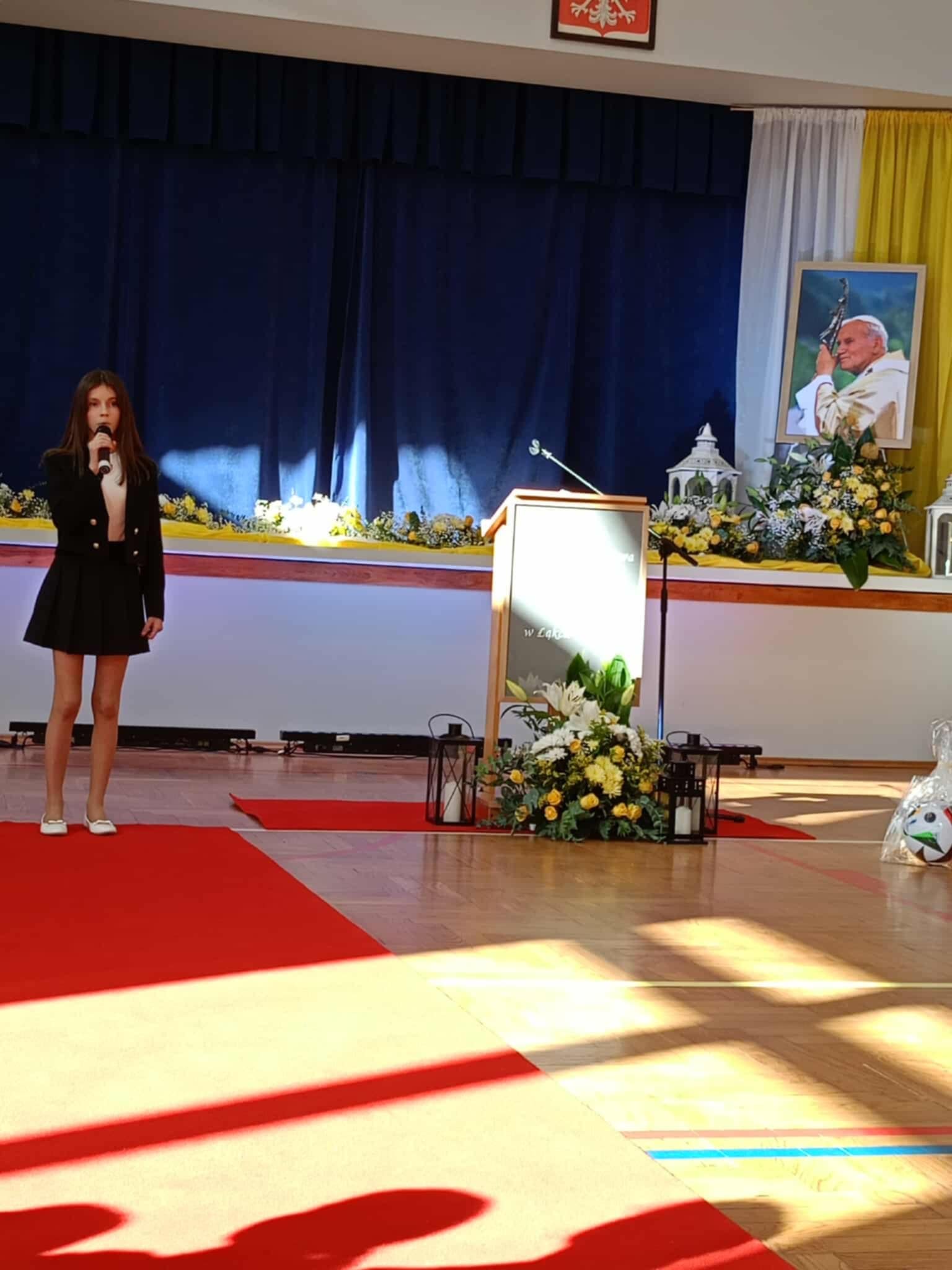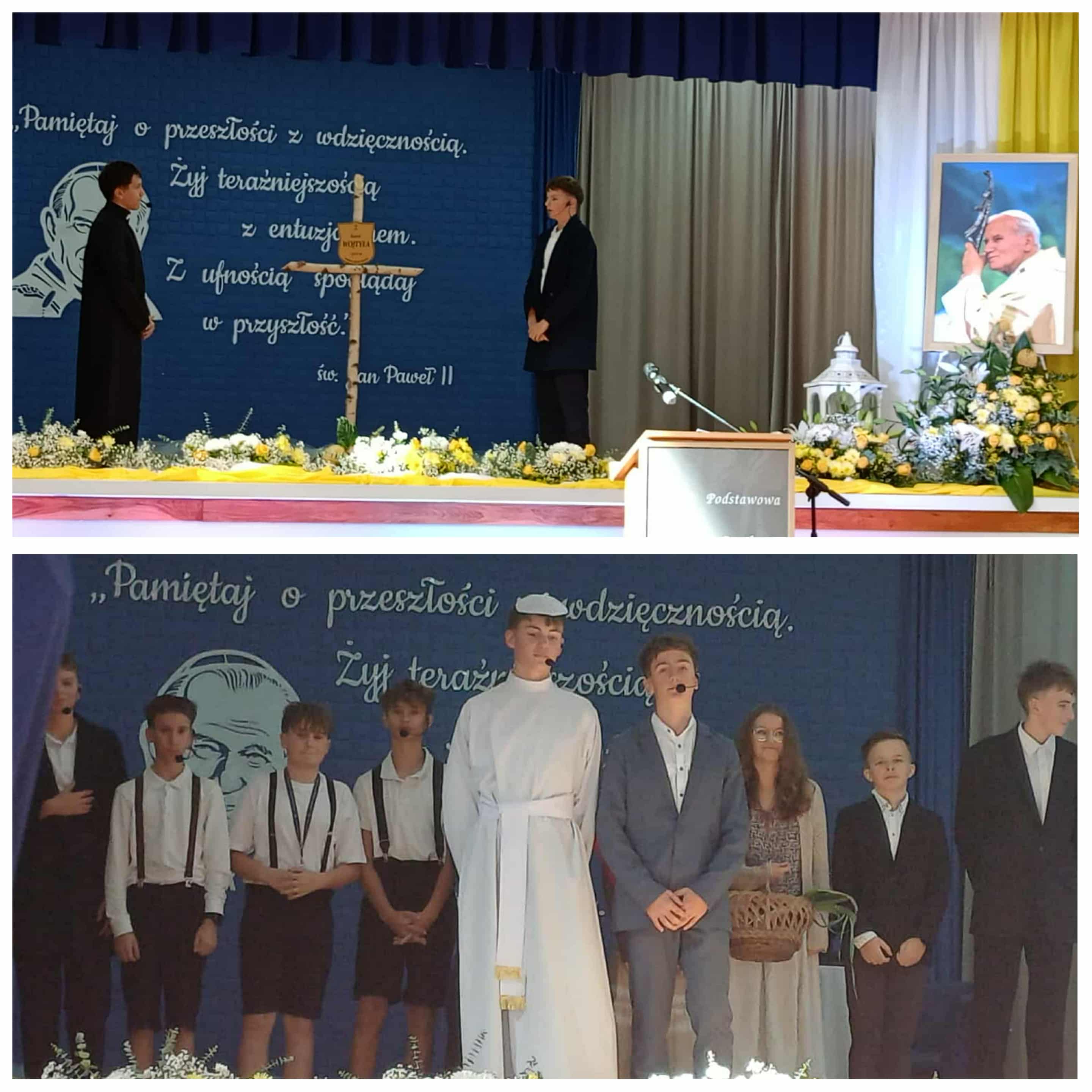 Szczególnym momentem dnia była część artystyczna, przygotowana przez uczniów klasy VIII pod kierunkiem pani Kamili Kaczmarczyk-Kępy. Młodzież zaprezentowała sceny z życia Jana Pawła II – od dzieciństwa po czasy pontyfikatu. Zakończeniem części artystycznej był występ uczennic klasy VIII w formie nowoczesnego happeningu, zakończonego wymownym przesłaniem: „Szkoła to coś więcej niż wyścig”. Uczniowie podzielili się swoimi marzeniami i oczekiwaniami wobec nowej szkoły, pokazując, że jest ona miejscem nie tylko nauki, ale też wzajemnego wsparcia i rozwoju. Wyjątkowym momentem był także solowy występ uczennicy klasy VII Nadii Janiczek, która zaśpiewała wzruszającą piosenkę przy akompaniamencie pani Joanny Jankowskiej. Publiczność nagrodziła artystów gromkimi brawami, doceniając ich talent i zaangażowanie.