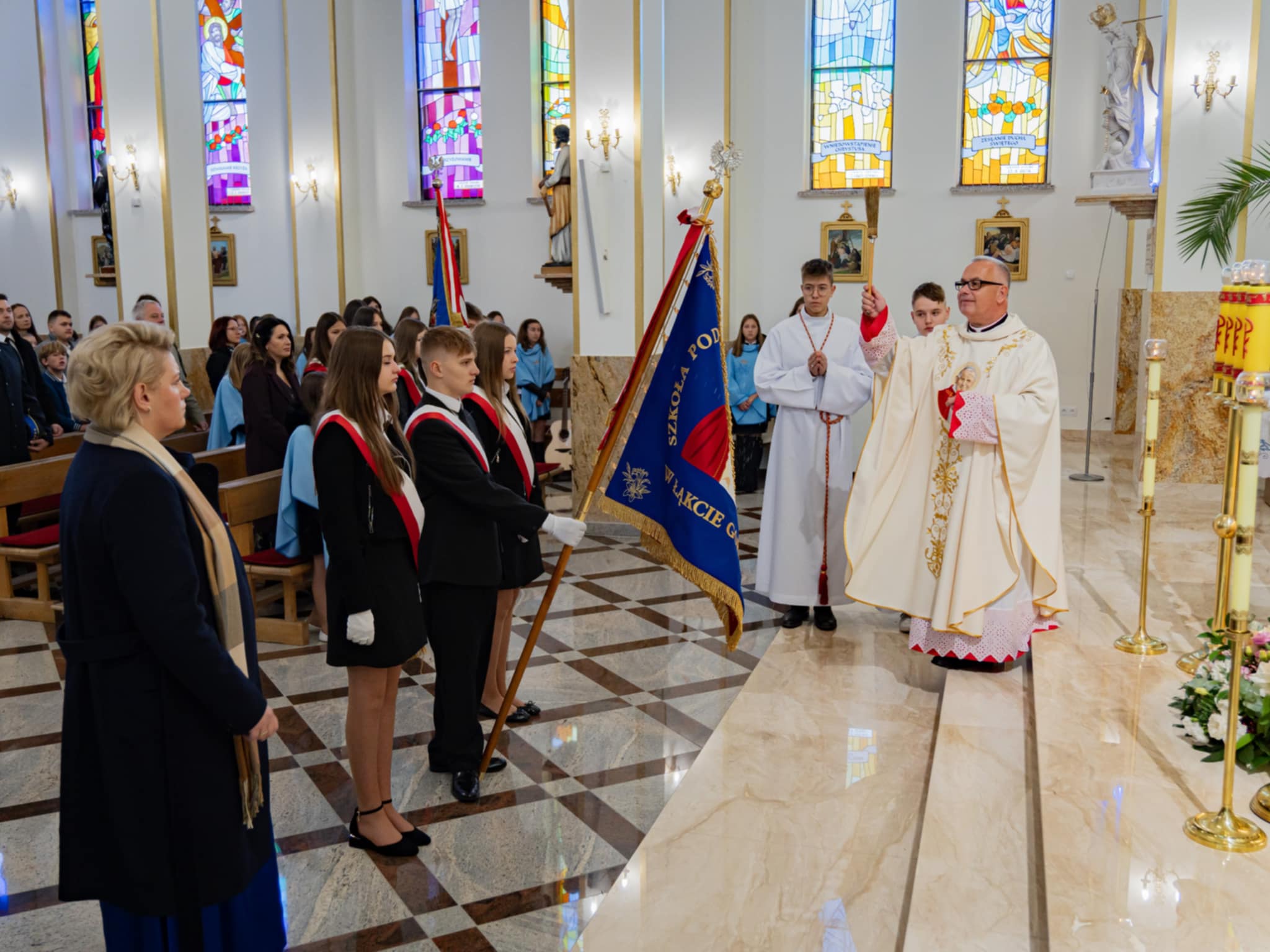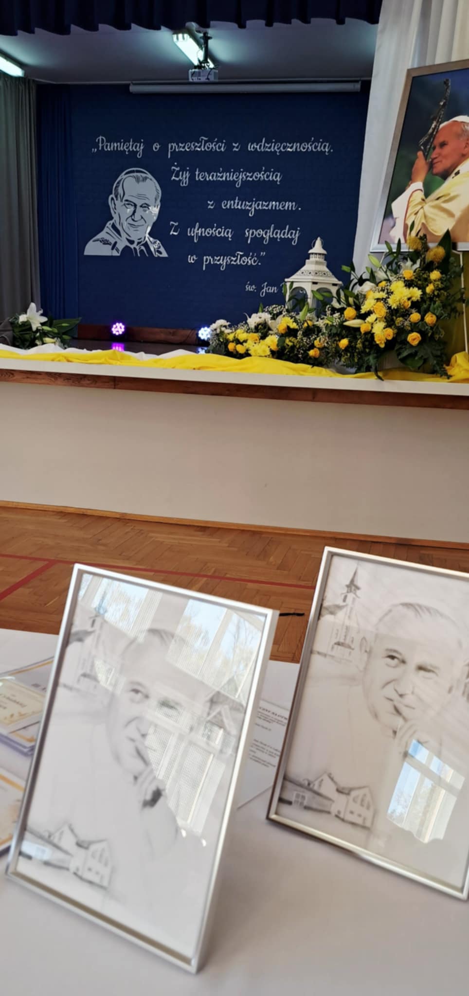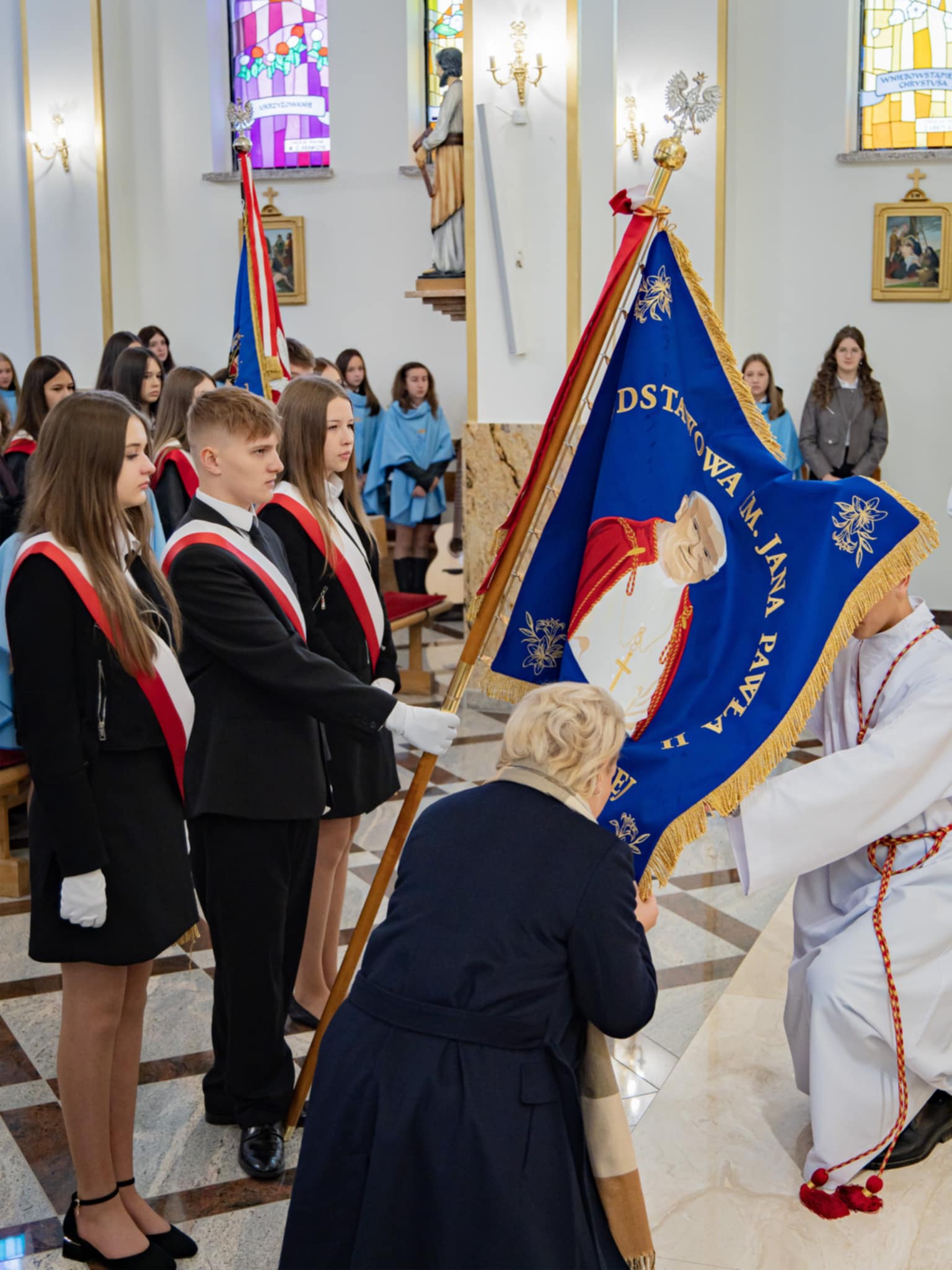 Szczególnym momentem dnia była część artystyczna, przygotowana przez uczniów klasy VIII pod kierunkiem pani Kamili Kaczmarczyk-Kępy. Młodzież zaprezentowała sceny z życia Jana Pawła II – od dzieciństwa po czasy pontyfikatu. Zakończeniem części artystycznej był występ uczennic klasy VIII w formie nowoczesnego happeningu, zakończonego wymownym przesłaniem: „Szkoła to coś więcej niż wyścig”. Uczniowie podzielili się swoimi marzeniami i oczekiwaniami wobec nowej szkoły, pokazując, że jest ona miejscem nie tylko nauki, ale też wzajemnego wsparcia i rozwoju. Wyjątkowym momentem był także solowy występ uczennicy klasy VII Nadii Janiczek, która zaśpiewała wzruszającą piosenkę przy akompaniamencie pani Joanny Jankowskiej. Publiczność nagrodziła artystów gromkimi brawami, doceniając ich talent i zaangażowanie.