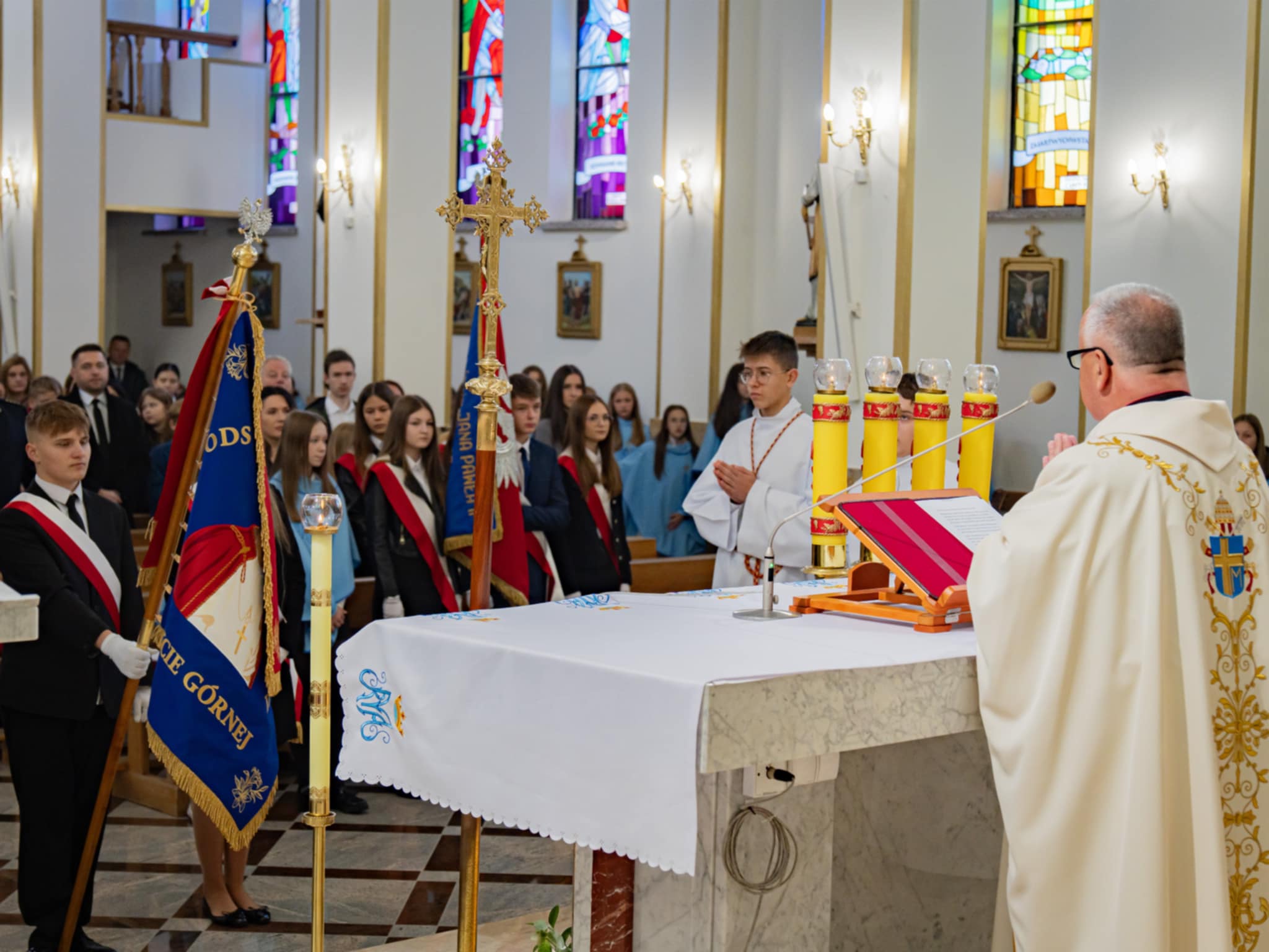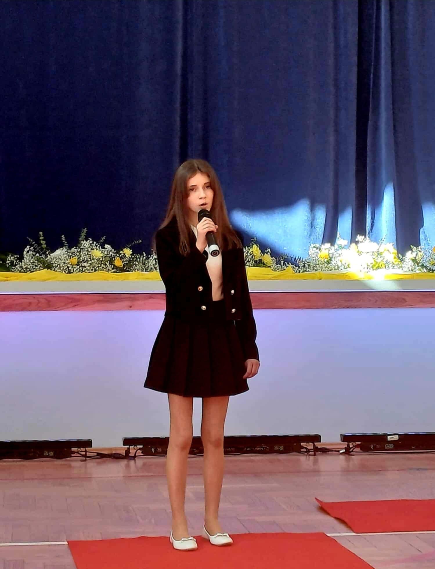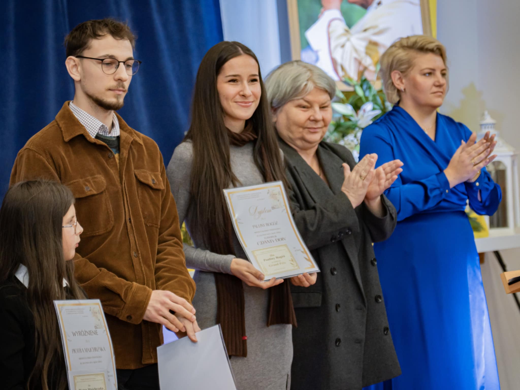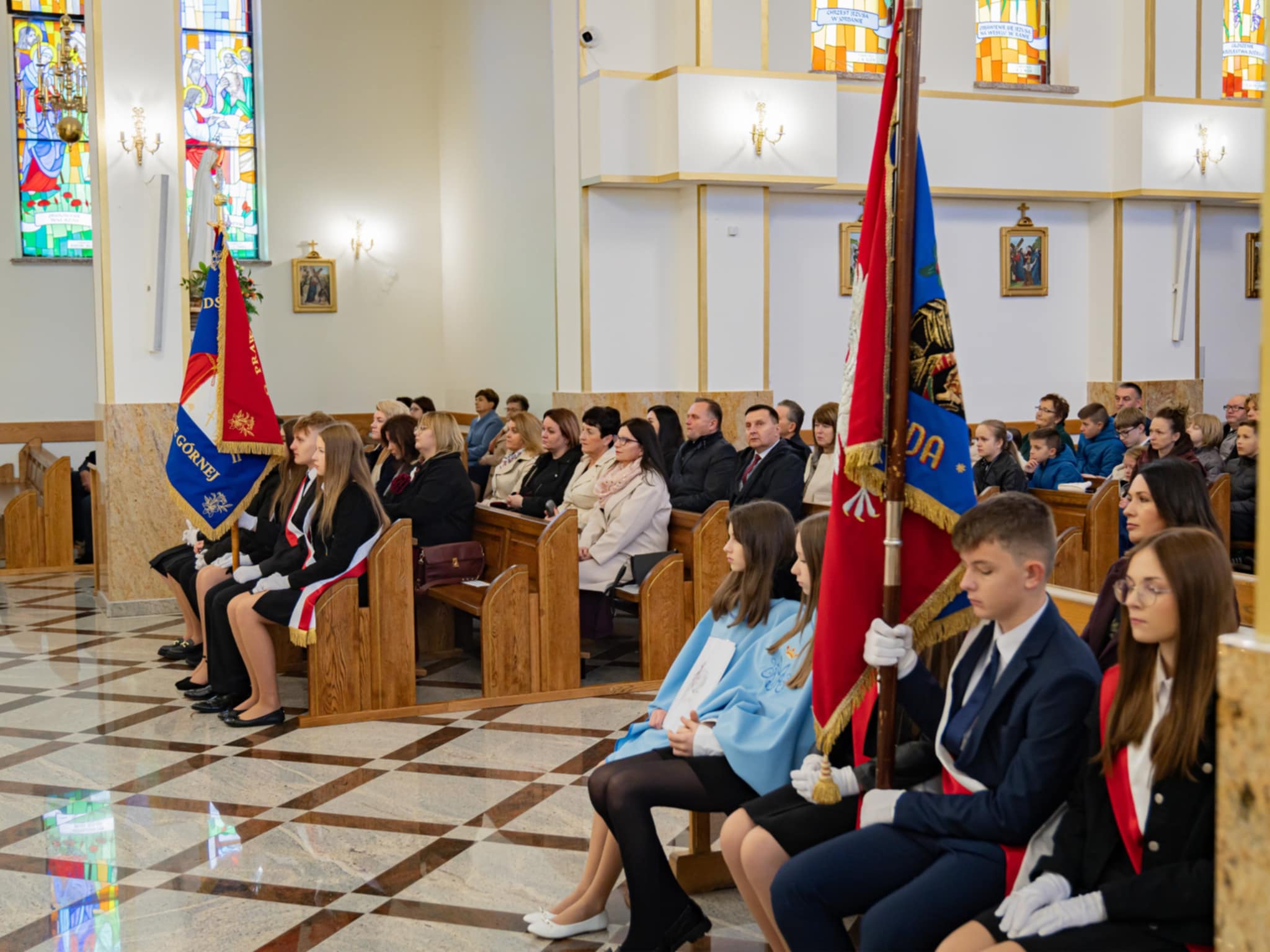 Szczególnym momentem dnia była część artystyczna, przygotowana przez uczniów klasy VIII pod kierunkiem pani Kamili Kaczmarczyk-Kępy. Młodzież zaprezentowała sceny z życia Jana Pawła II – od dzieciństwa po czasy pontyfikatu. Zakończeniem części artystycznej był występ uczennic klasy VIII w formie nowoczesnego happeningu, zakończonego wymownym przesłaniem: „Szkoła to coś więcej niż wyścig”. Uczniowie podzielili się swoimi marzeniami i oczekiwaniami wobec nowej szkoły, pokazując, że jest ona miejscem nie tylko nauki, ale też wzajemnego wsparcia i rozwoju. Wyjątkowym momentem był także solowy występ uczennicy klasy VII Nadii Janiczek, która zaśpiewała wzruszającą piosenkę przy akompaniamencie pani Joanny Jankowskiej. Publiczność nagrodziła artystów gromkimi brawami, doceniając ich talent i zaangażowanie.