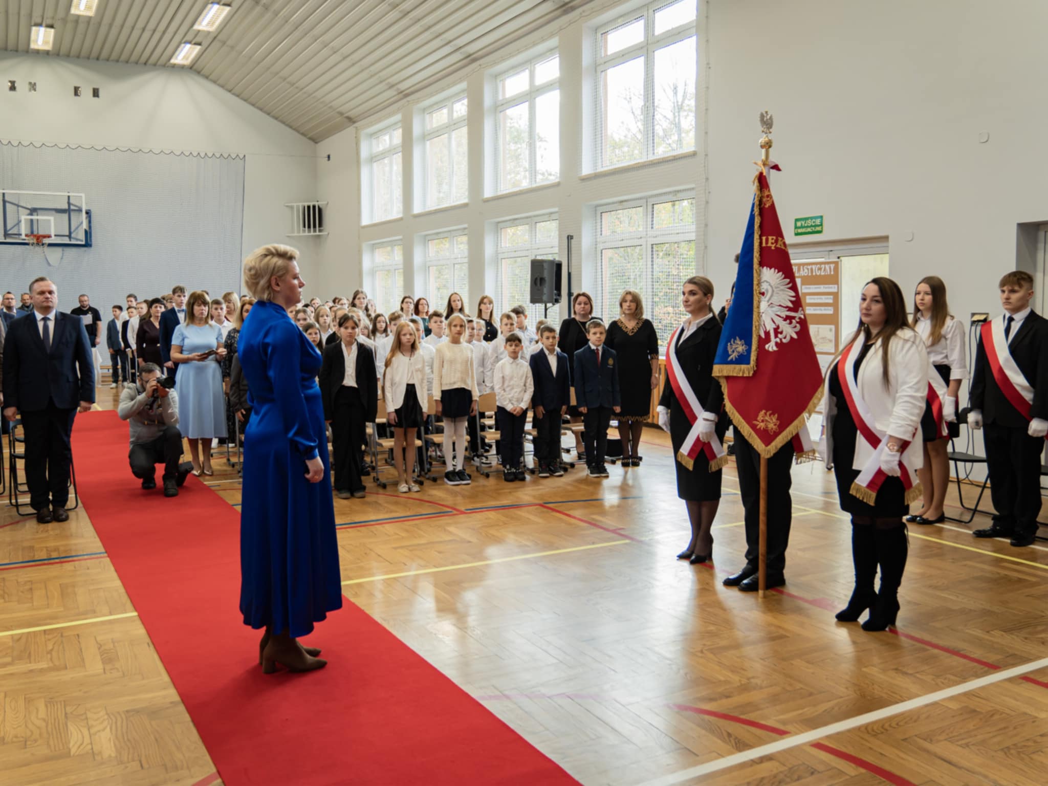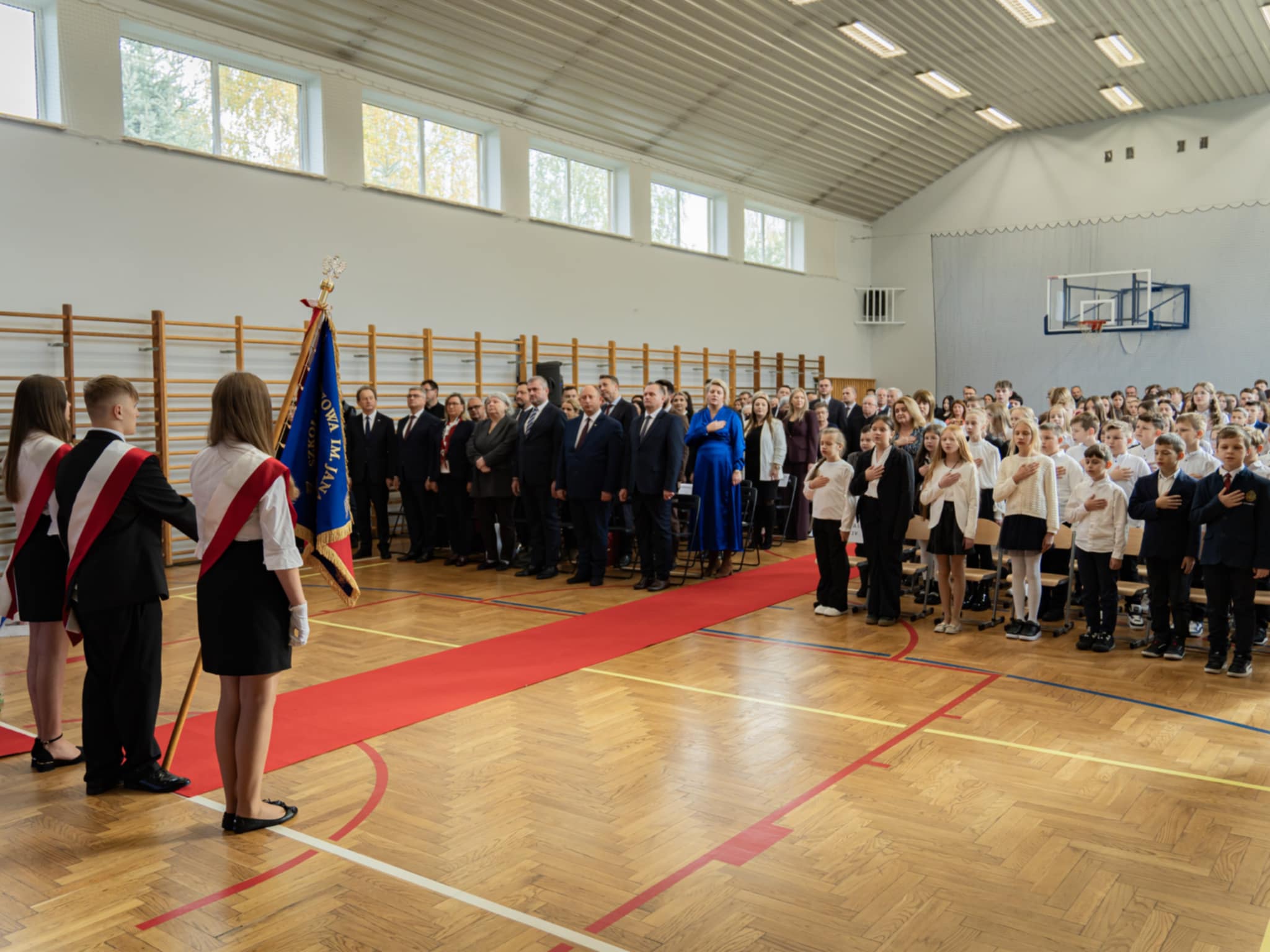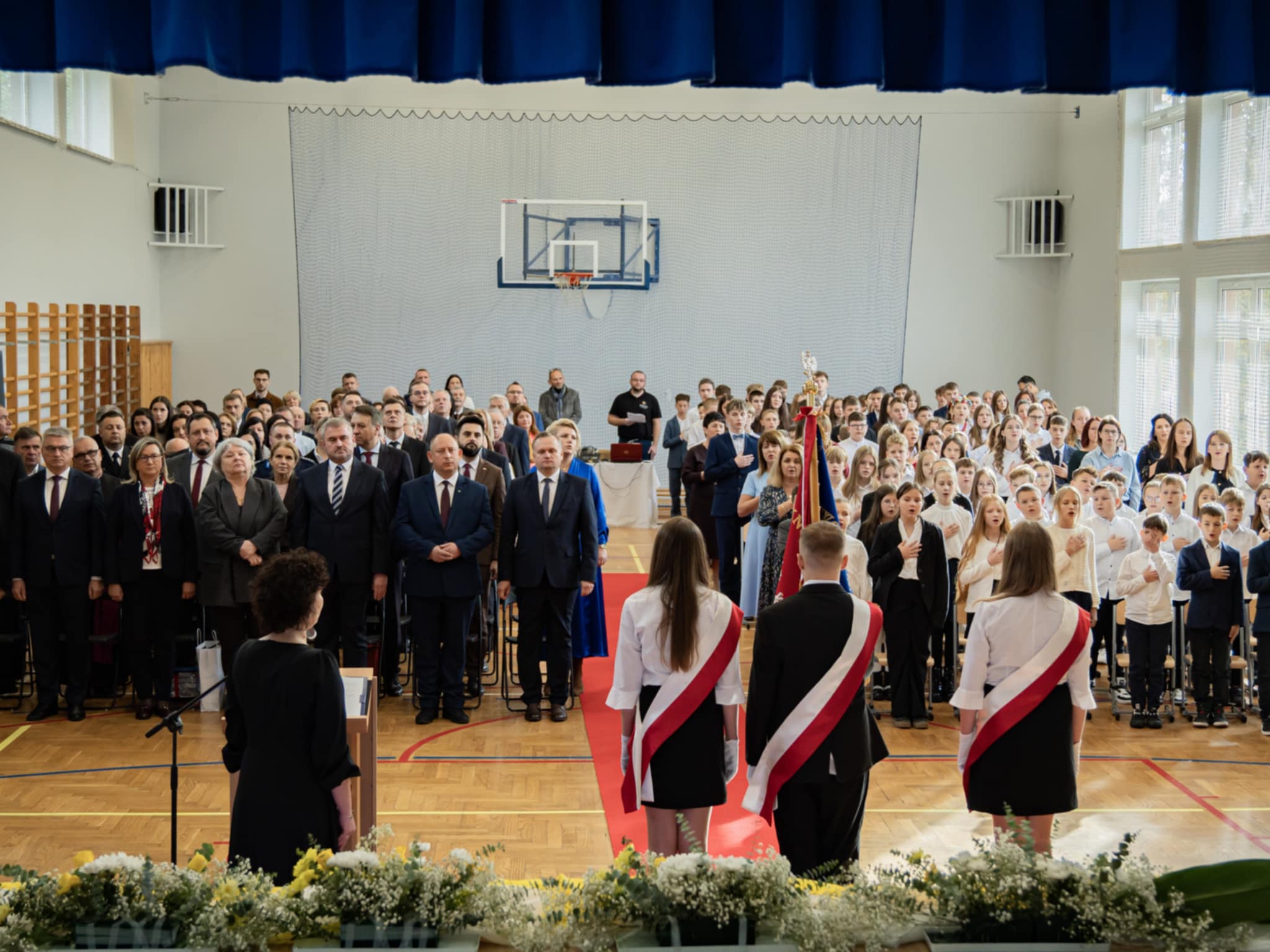 Nie zabrakło również przemówień zaproszonych gości, którzy z serdecznością gratulowali społeczności szkolnej nowoczesnego budynku i pięknego sztandaru. W swoich wystąpieniach przekazali wiele ciepłych słów wsparcia, otuchy i motywacji do dalszej nauki i pracy, podkreślając, jak ważna jest edukacja, współpraca i wspólne działanie na rzecz dobra młodego pokolenia.