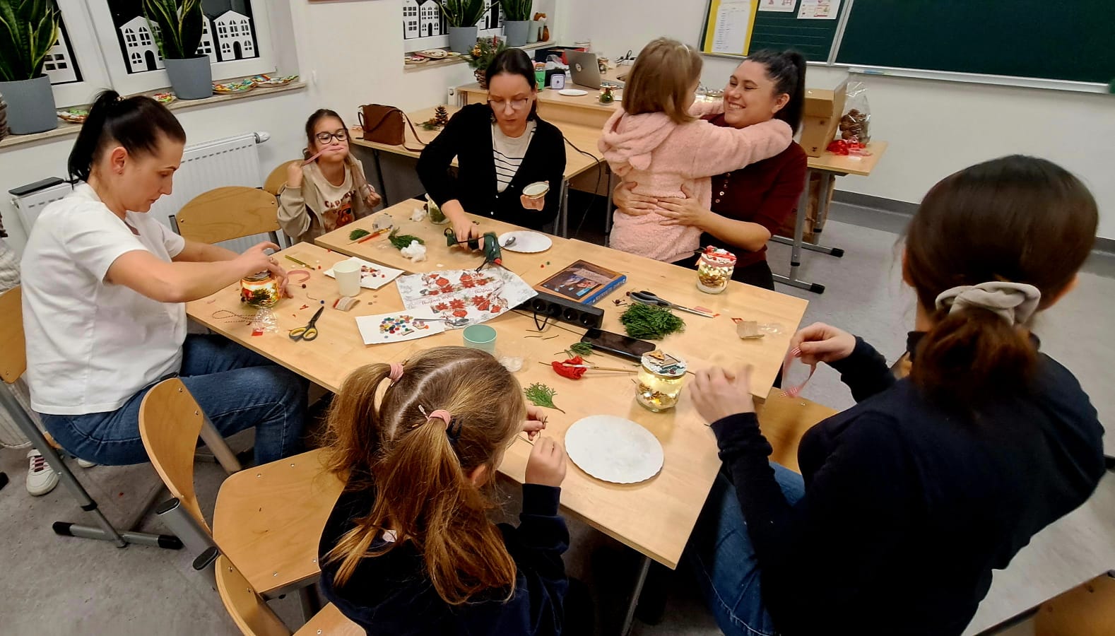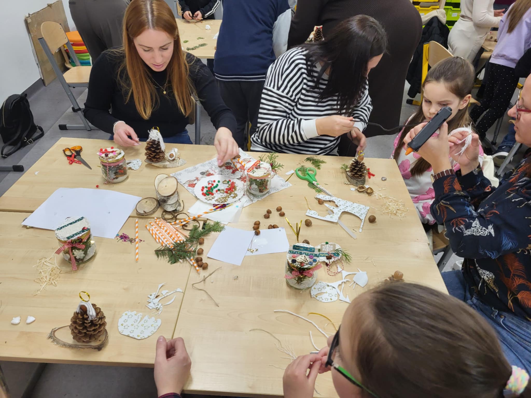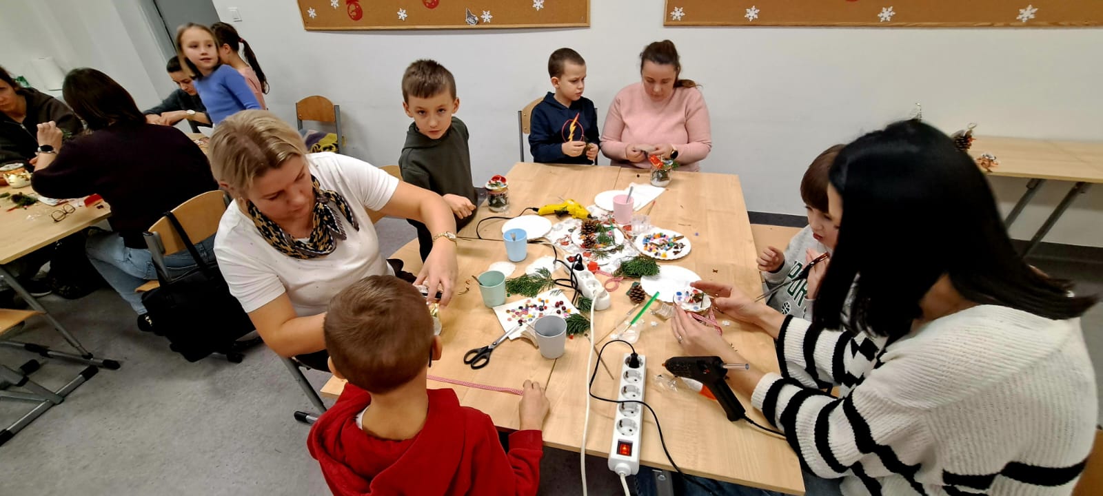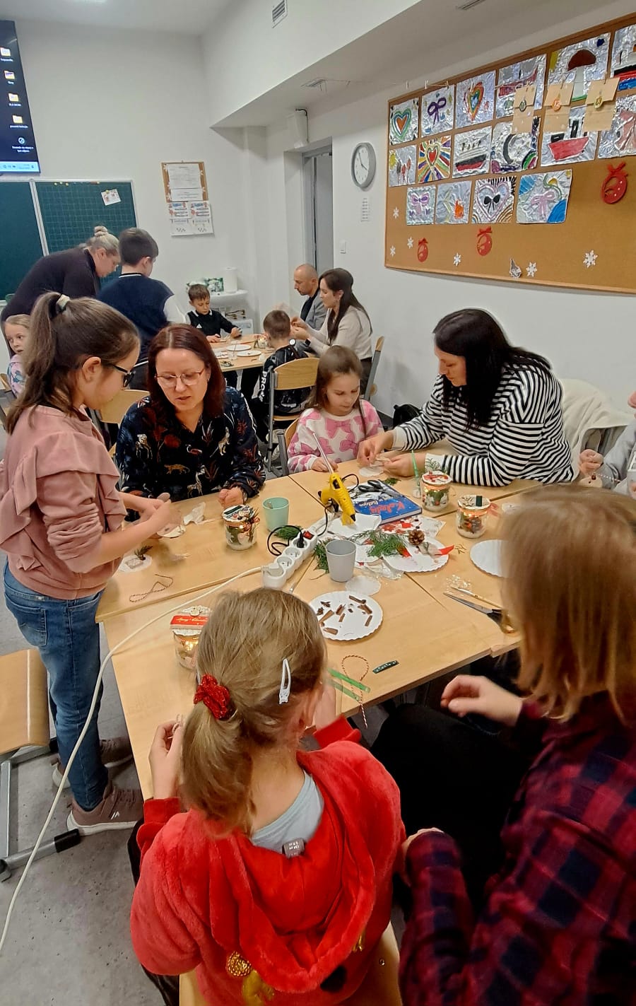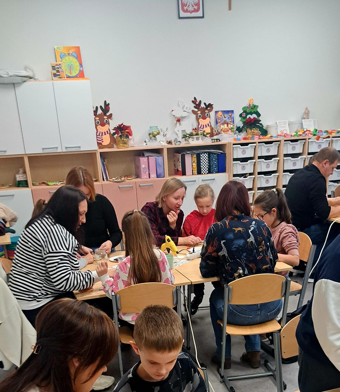 Magię Świąt mieli okazję poczuć uczniowie klas pierwszych i drugich naszej szkoły, uczestnicząc wraz z rodzicami w warsztatach bożonarodzeniowych, które odbyły się wieczorową pora 10 grudnia 2025r. Ze względów organizacyjnych, licznie zgromadzonych uczestników, prowadzące warsztaty pani M. Badyla i A. Brydniak podzieliły na dwie grupy warsztatowe. Celem spotkania było przybliżenie tradycji bożonarodzeniowych oraz wspólne wykonanie ozdób świątecznych przy melodiach nieco mniej znanych kolęd. Jednak najważniejszym okazał czas spędzony razem dzieci i rodziców. Praca zespołowa była bardzo owocna i powstały piękne dekoracje, które dzieci mogły zabrać ze sobą. Część z nich rodzice przekazali na Szkolny Kiermasz Świąteczny.