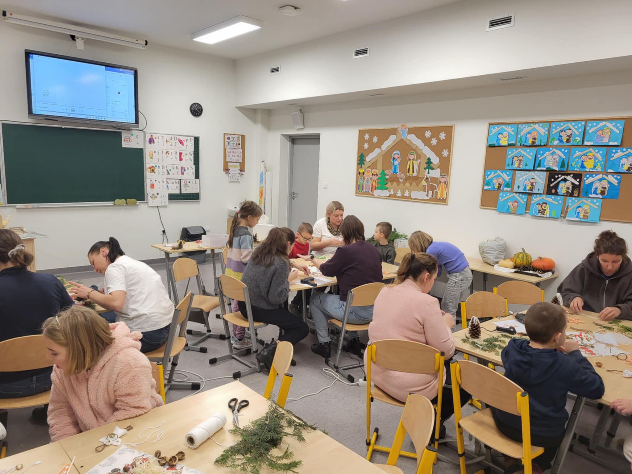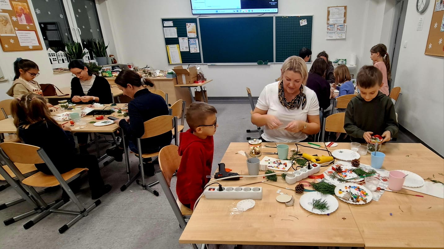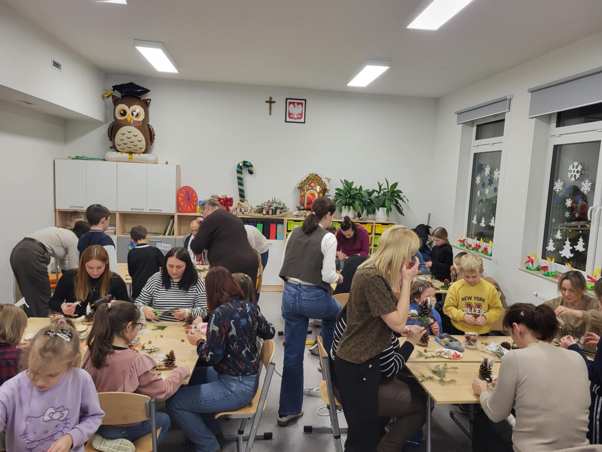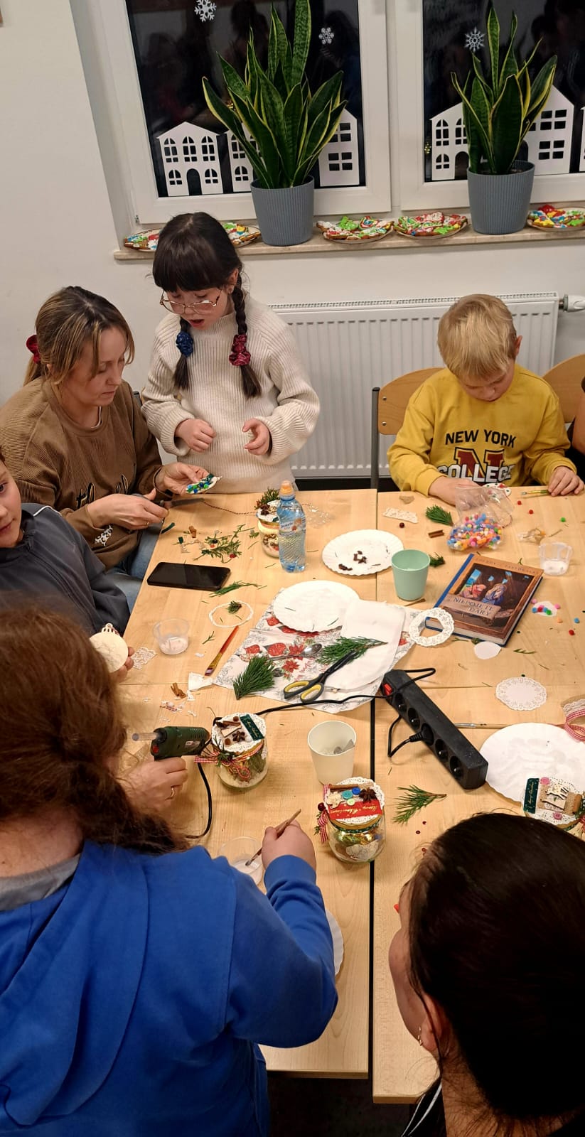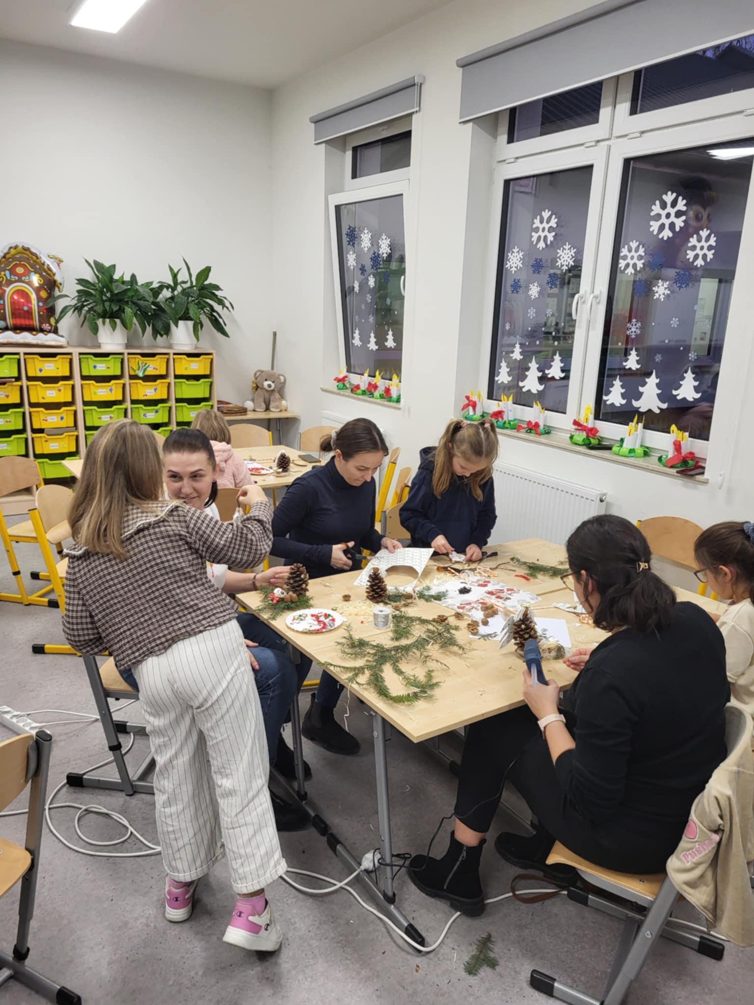 Magię Świąt mieli okazję poczuć uczniowie klas pierwszych i drugich naszej szkoły, uczestnicząc wraz z rodzicami w warsztatach bożonarodzeniowych, które odbyły się wieczorową pora 10 grudnia 2025r. Ze względów organizacyjnych, licznie zgromadzonych uczestników, prowadzące warsztaty pani M. Badyla i A. Brydniak podzieliły na dwie grupy warsztatowe. Celem spotkania było przybliżenie tradycji bożonarodzeniowych oraz wspólne wykonanie ozdób świątecznych przy melodiach nieco mniej znanych kolęd. Jednak najważniejszym okazał czas spędzony razem dzieci i rodziców. Praca zespołowa była bardzo owocna i powstały piękne dekoracje, które dzieci mogły zabrać ze sobą. Część z nich rodzice przekazali na Szkolny Kiermasz Świąteczny.
