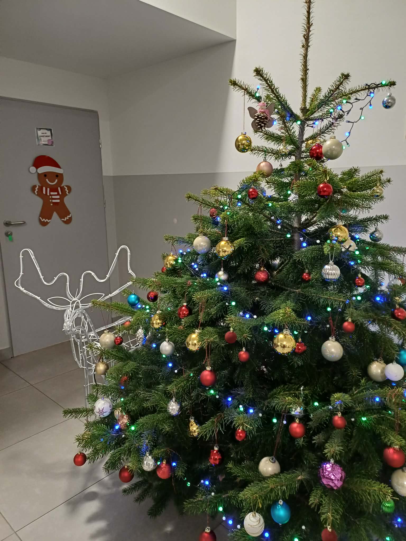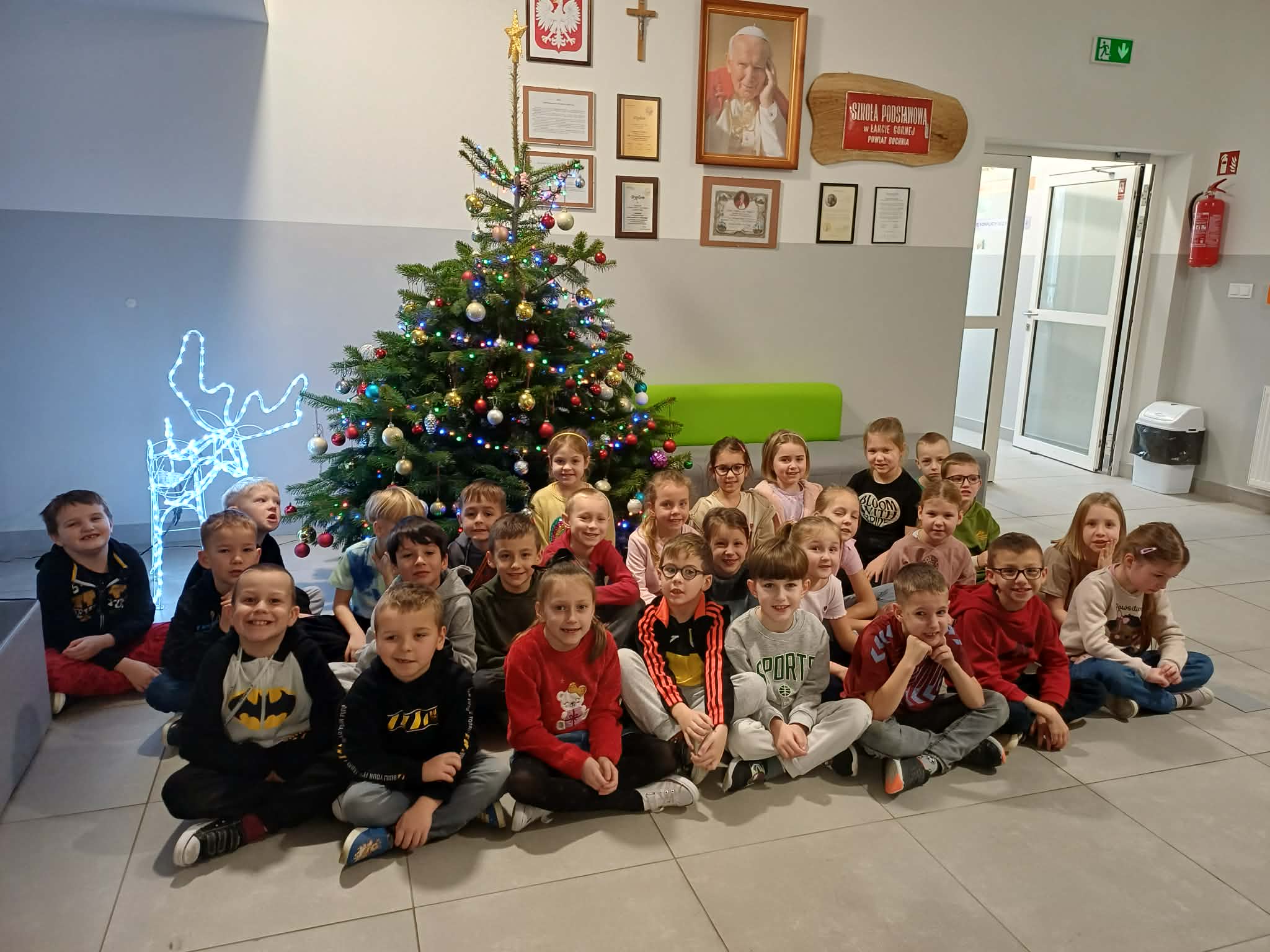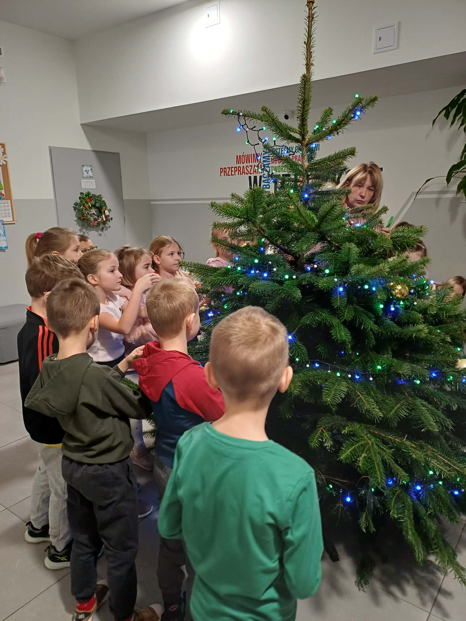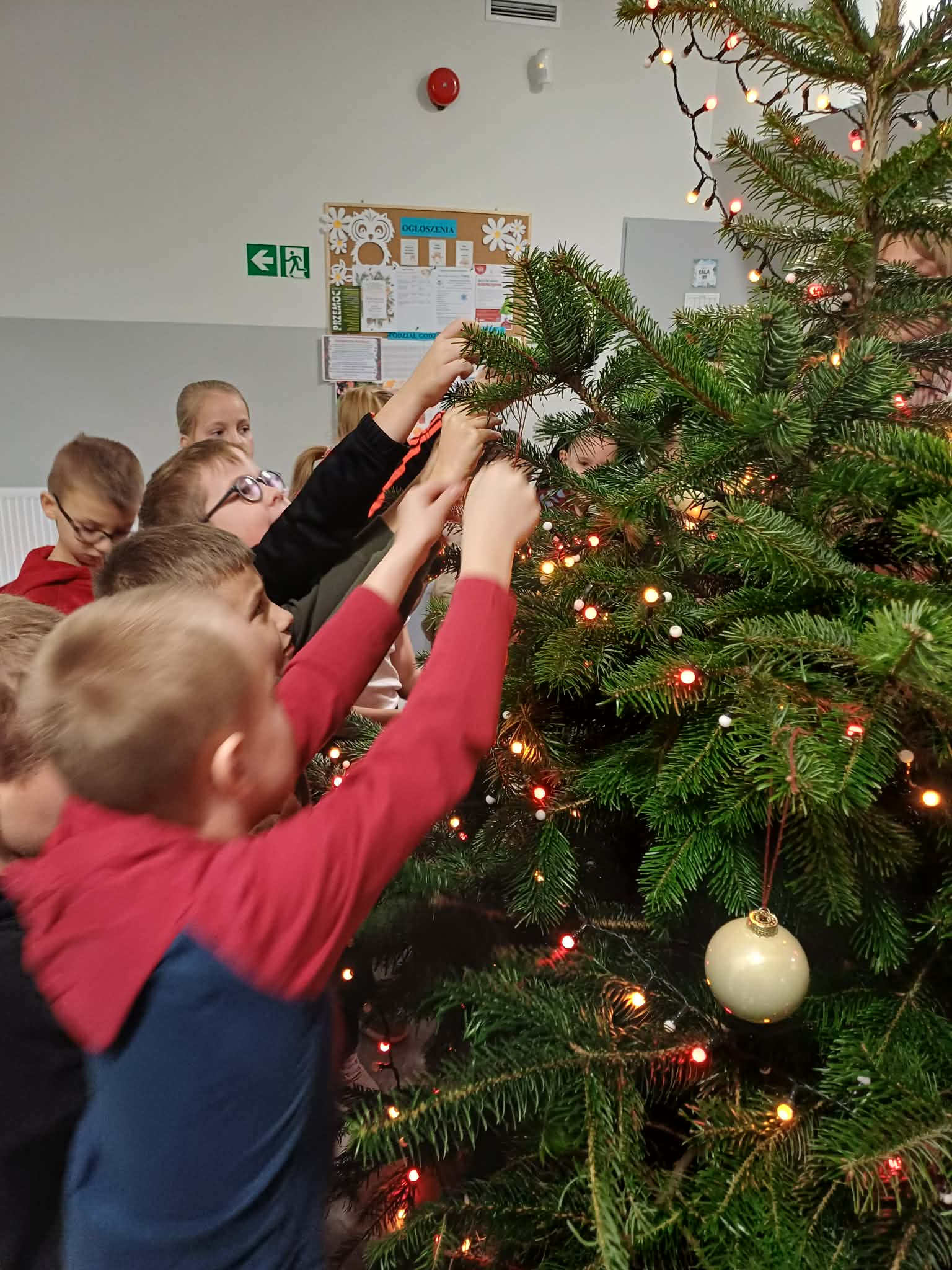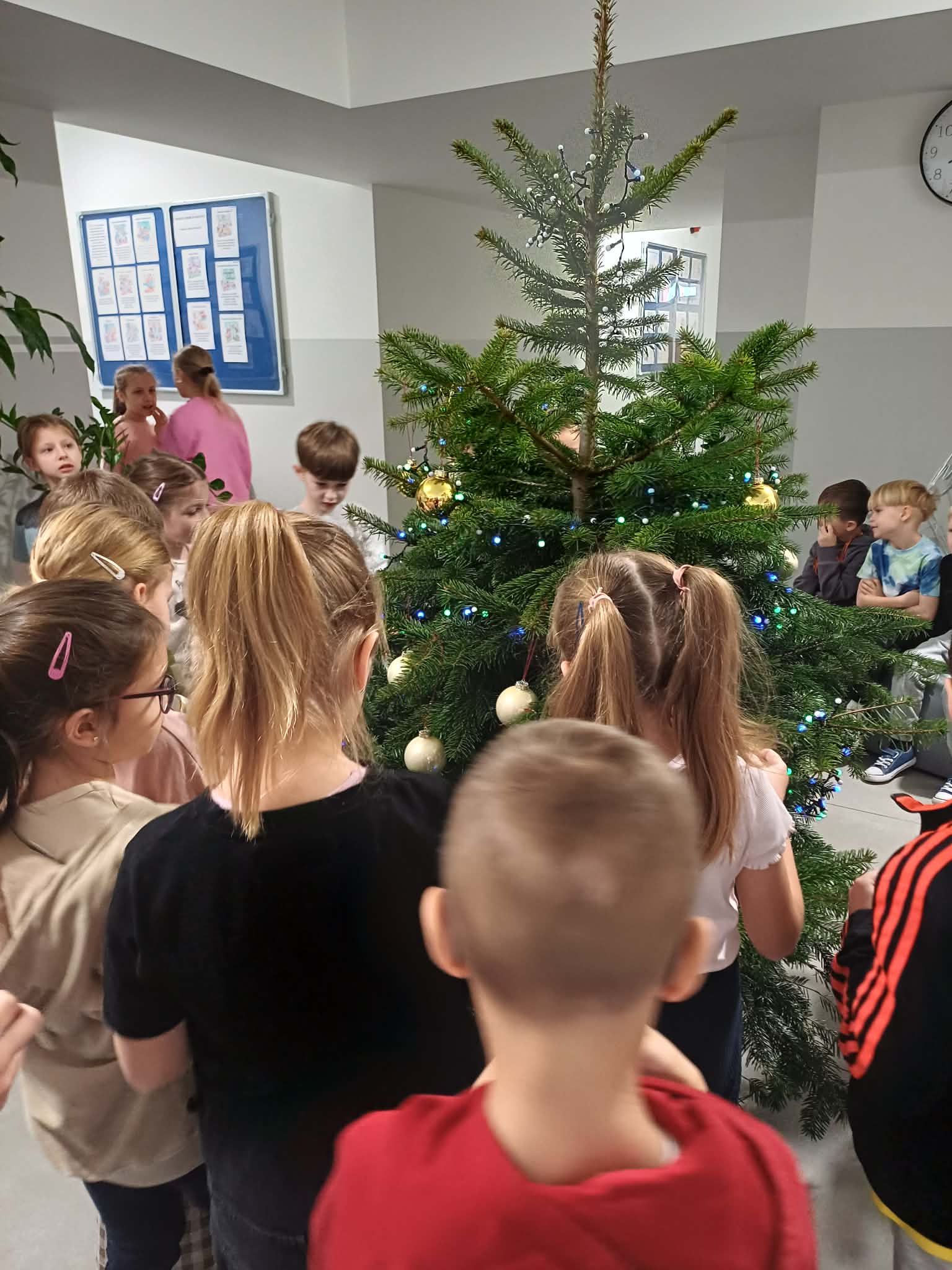 Święta tuż, tuż... Przepięknie ozdobili śliczną żywą choinkę w holu szkoły pierwszoklasiści. Zawisły na niej bombki, łańcuch i kolorowe lampki. Choinka wzbudza zachwyt! Nastrój świąteczny panuje już w całej szkole. Każda klasa jest świątecznie odobiona. Słychać w nich śpiew kolęd oraz rozmowy o śwątecznych zwyczajach i tradycjach bożonarodzeniowych.