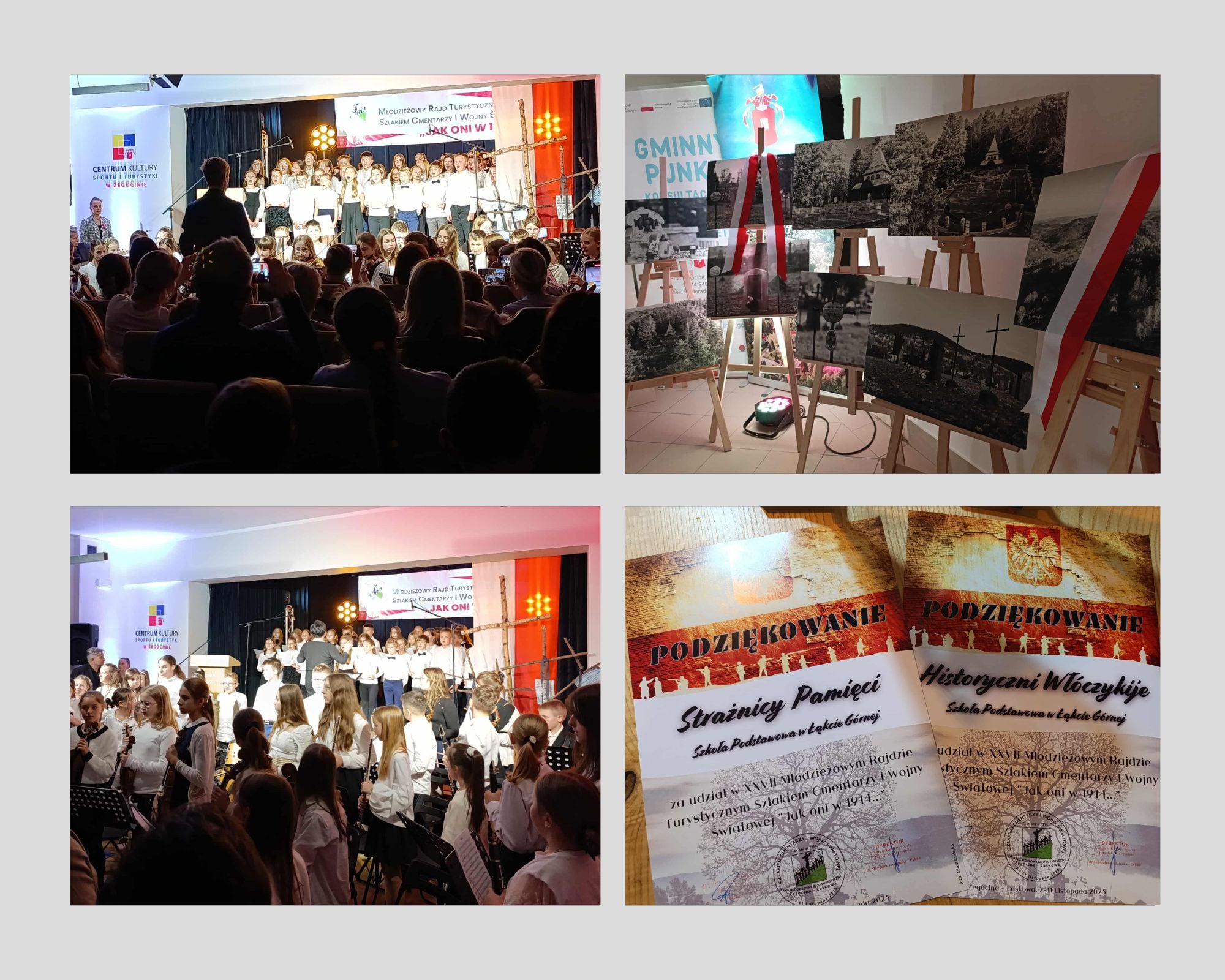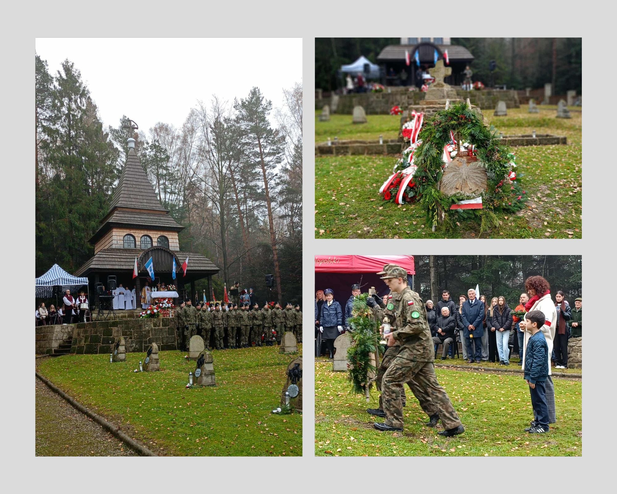 Z kolei delegacja ze szkoły wraz z opiekunem uczestniczyła 11 listopada w uroczystościach patriotycznych na cmentarzu na „Jastrząbce”. Uroczyste obchody Święta Niepodległości rozpoczęły się o godzinie 10:30. Delegacje szkół z obu gmin składały wieńce i znicze przy grobach żołnierzy. Następnie odbyła się msza święta w intencji poległych żołnierzy. Bezpośrednio po niej zostały wręczone nagrody uczestnikom rajdu. Nie zabrakło też ciepłych, regionalnych potraw i gorącej herbaty. Dzięki tej pięknej lekcji historii młodzież mogła zgłębić wiedzę na temat I Wojny Światowej.