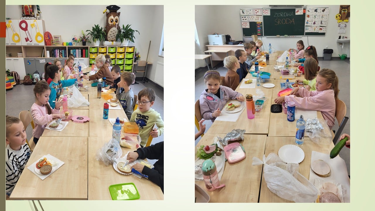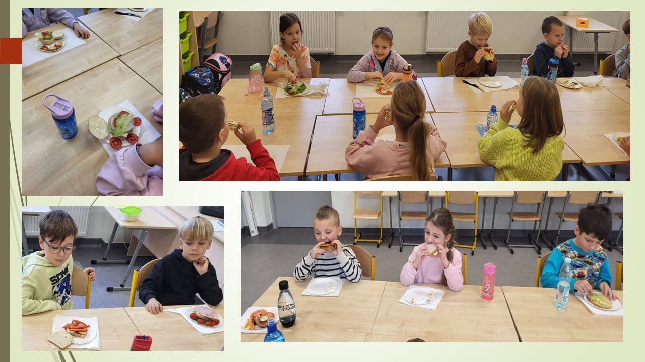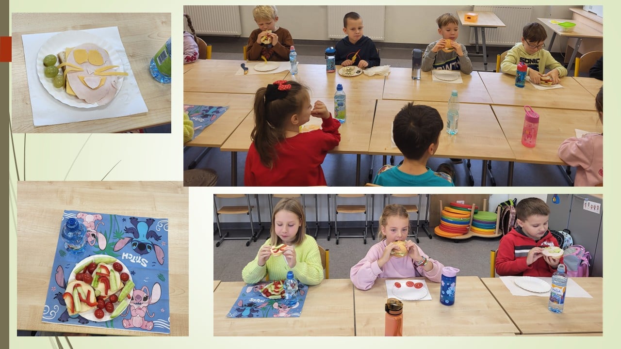 29 października uczniowie klasy 1b, w ramach realizowanych treści o zdrowym odżywianiu, wraz z wychowawczynią zorganizowali ZRDOWĄ ŚRODĘ. W tym dniu nie przynosili do szkoły słodyczy i kolorowych napojów. W zamian za to przynieśli zdrowe produkty, z których wykonali pyszne, odżywcze kanapki oraz wodę do picia. Podczas wspólnej degustacji, kanapki smakowały jeszcze bardziej.