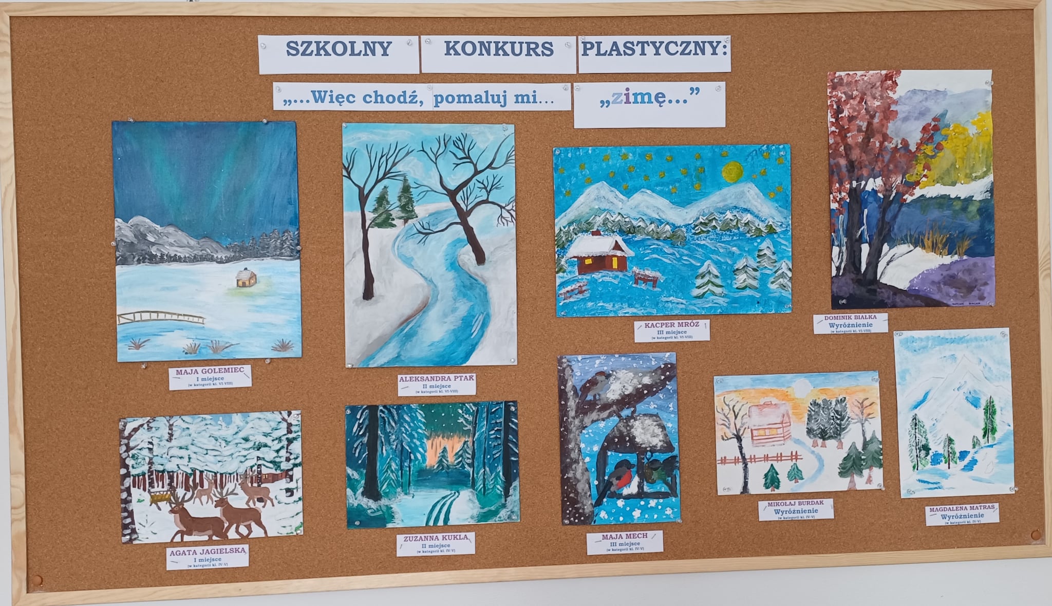 Za nami druga już edycja Szkolnego Konkursu Plastycznego, wymyślonego przez nauczyciela plastyki i zorganizowanego we współpracy z Panią Dyrektor. Tym razem temat pracy plastycznej brzmiał: „ Więc chodź, pomaluj mi …. zimę ”.